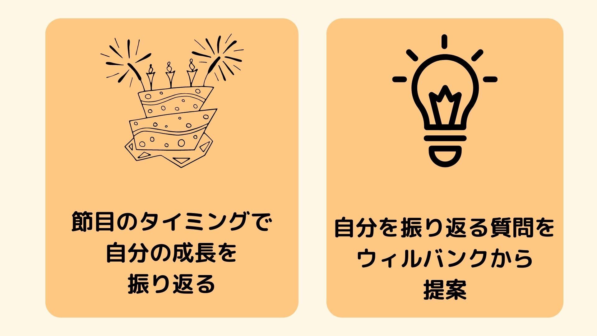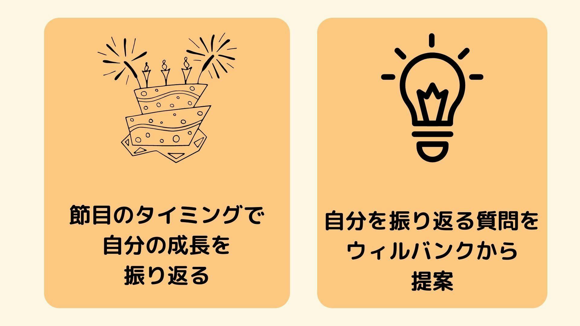 ウィルバンクは気持ちや写真を記録していくことが貯金のように未来の自分のためになると思って名付けました。記録を続けていくことが、新しい発見や楽しい気持ちを生み出し、未来の自分が振り返った時に支えになる存在に成長させたいです。