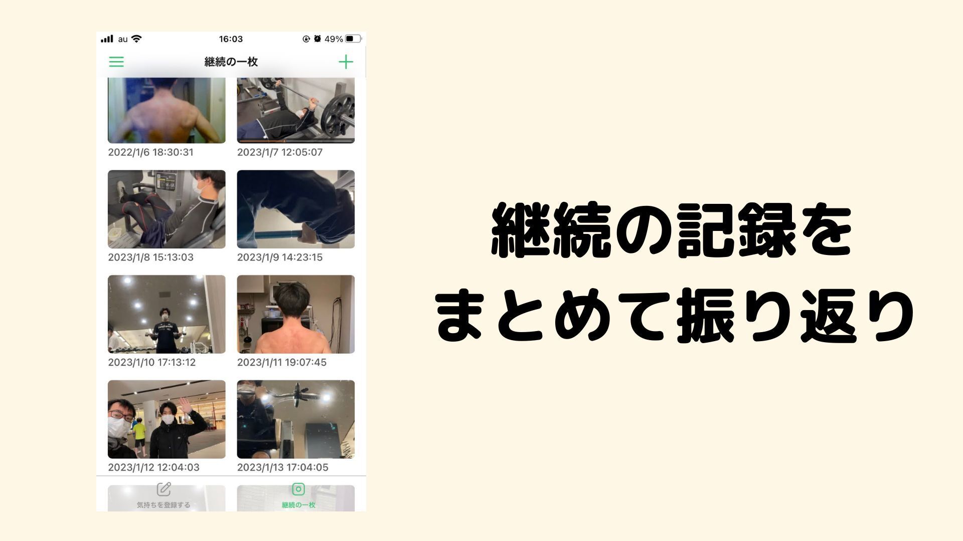 僕が充実感を得る瞬間は「今日やろうと決めたことができた時」です。その充実感を忘れないために写真に残して記録できれば、自分のこれまでの積み上げたものを見てより一層頑張る気持ちが生まれてきます。そのため、写真で「継続したいこと」を記録する機能を作ろうと思いました。