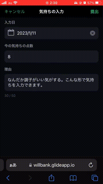 実際にウィルバンクでは気持ちを点数と短い文章で記録できるようにしています。