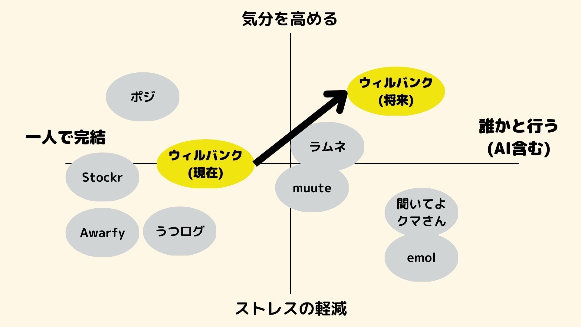 メンタルに関するアプリは多数あり、自分で実際に試してみたところ「1人で完結⇔誰かと行う」「ストレスの軽減⇔気分を高める」という2軸で考えられると思いました。ウィルバンクと他のメンタル関連のアプリをこの2つの観点でプロットしてみました。