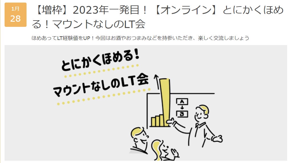 2023/01/28 19:00こんばんは!あべれんです!クラウドファンディング期間も残す所あと4日になりました!もともと2週間という短い期間ではありましたが、本当にあっという間です!最終日のイベントに向けて準備も進めておりますので、ご都合合う方はぜひお越しください~自分の学びを振り返るLT会!本日の21時からこちらのLT会に登壇してきます!【増枠】2023年一発目!【オンライン】とにかくほめる!マウントなしのLT会僕自身の活動紹介ももちろんですが、色んな人の活躍を聞くことができるのがLTイベントの面白い点ですね!今日も楽しく登壇してきます!あべれん もっと見る