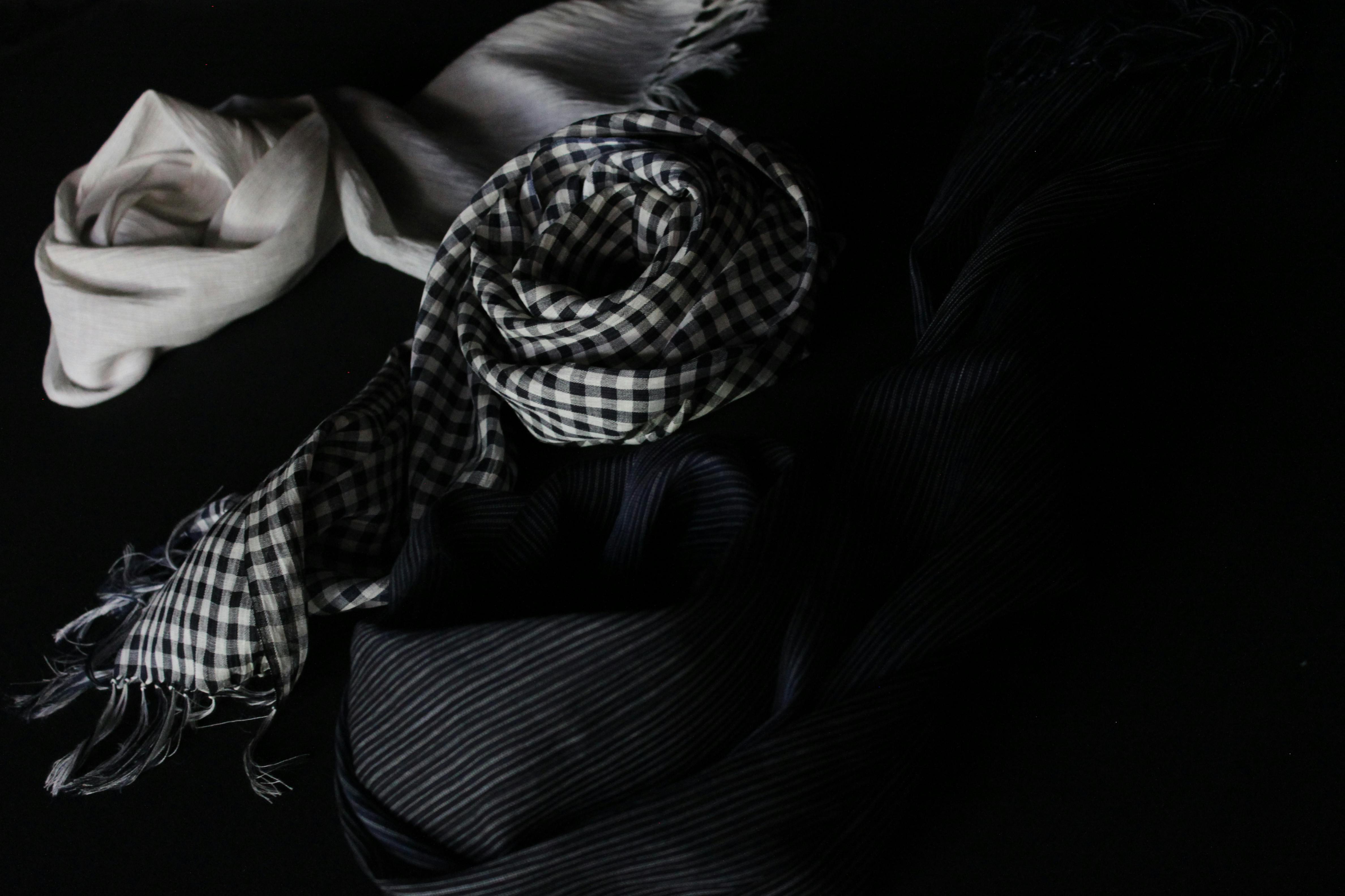 織りは生地に膨らみ感がでるよう、経糸をあまり張らずに織る事の出来る古い小巾シャトル織機を使用し、紡績ムラ、染色ロットムラが出ないよう、緯糸が無地の物も必ず二杼以上で、回転数を落とし、織っています。