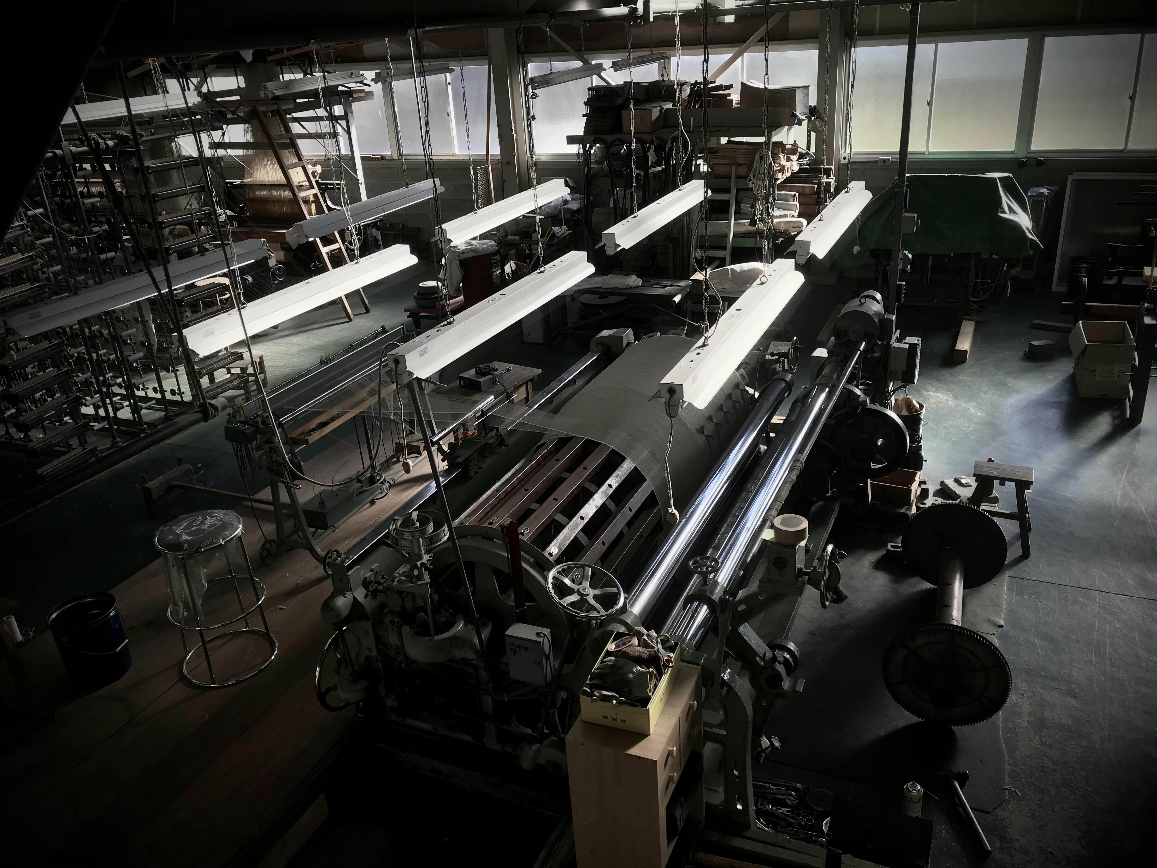 岩間製作所と言うメーカーのもので、シャトルを最大四杼まで同時に使用することができる力織機です、一般的には片四(カタヨン)と呼ばれています。0.01は全てこの織機一台で織っています。昭和45年頃に愛知県で作られました。現在は生産されていません。