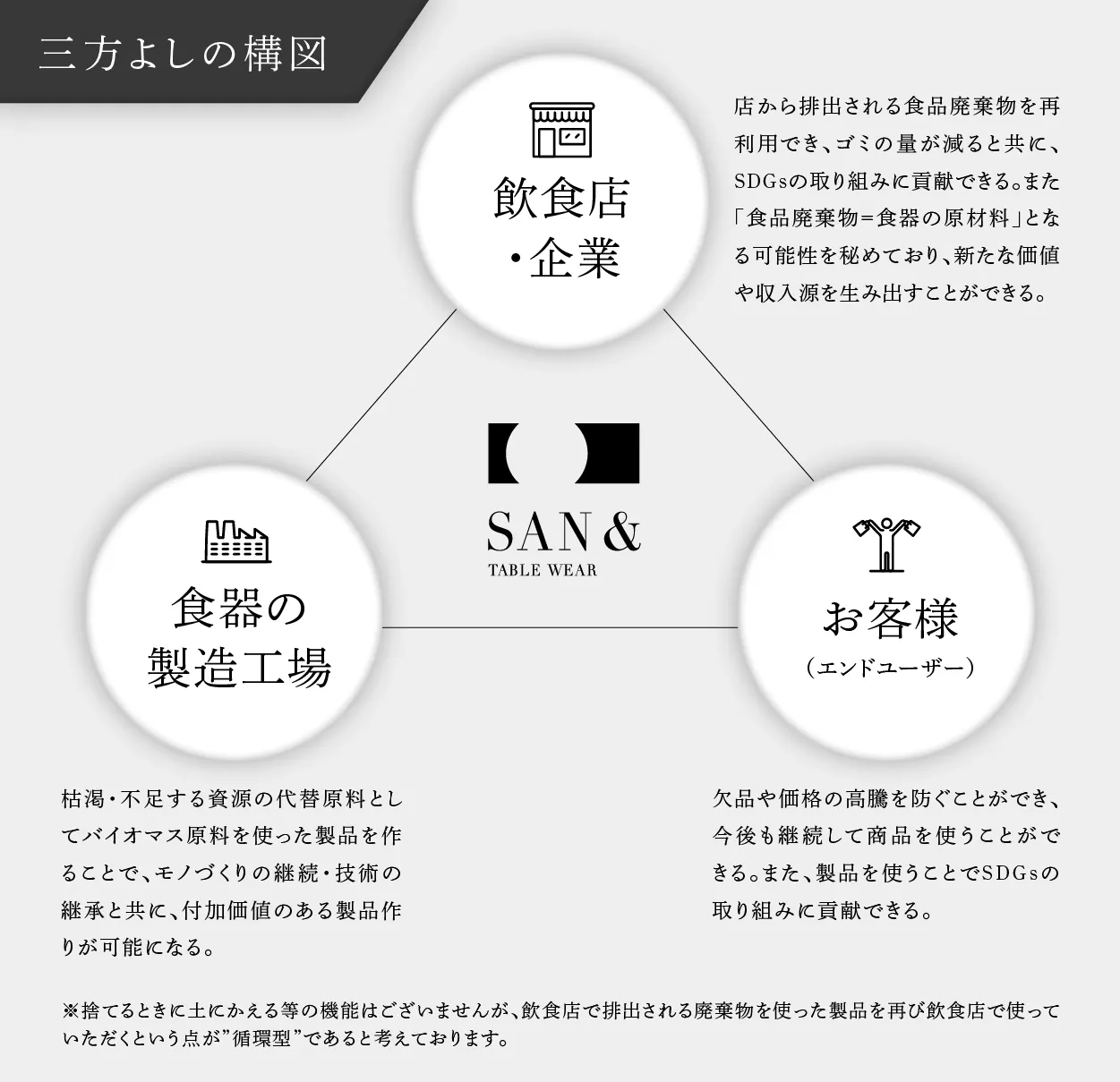 大橋洋食器が多数の地元飲食店に食器を卸していた繋がりや、「食品」をのせる食器を販売している会社だからこそ、今回原料として「食品廃棄物」を選びましたが、この取り組みが成功すれば、下記のような「三方よしの構図」を実現できると思っています。