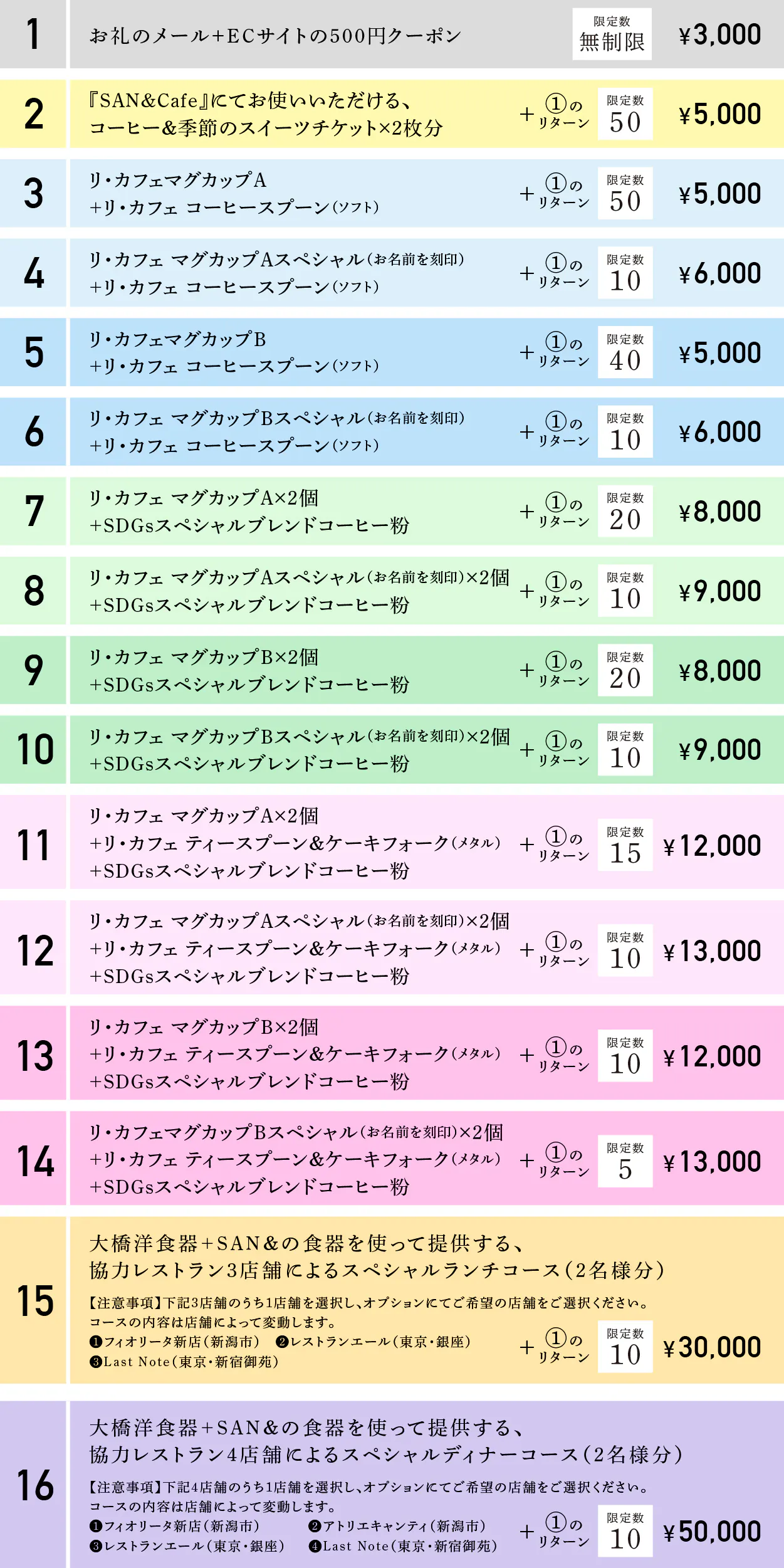 今回ご支援いただきます皆さまに、リ・カフェ製品をはじめ、ご支援金額ごとに16種類の返礼品をご用意させていただきました。
