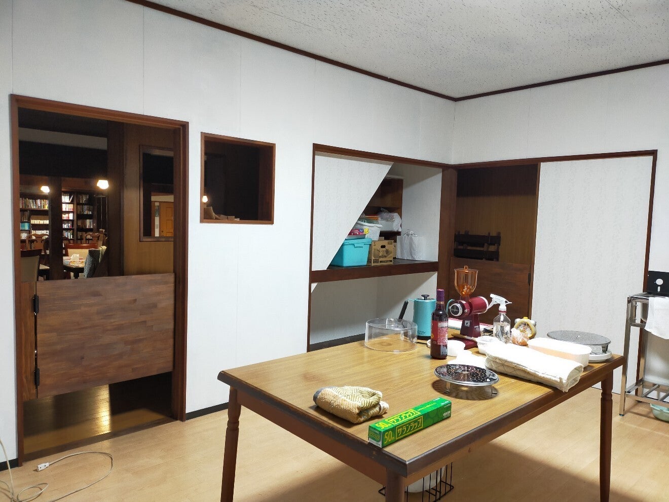 >> user_houzyuhonoka様へご支援ありがとうございます!私は楽しみと不安がごっちゃごちゃです^^;ラストスパート、できるだけ進めていきます!これからも応援をお願いいたします。 >> RITOO様へご支援ありがとうございます!わくわくの期待に応えられるようなカフェになるよう、最終仕上げを頑張ります。これからも応援をお願いします! >> user_e29c752b58f4様へご支援ありがとうございます!こんなカフェがあったらいいなと思っていただけていたとは、嬉しすぎます!ここあたりにはブックカフェはないですからね…。お待ちしております^^これからも応援をお願いいたします!前々回に、保健所の許可が下りなかったことをお話ししました。今日、許可対策の為の工事&DIYが終わったので報告します!こちらが施工前のお部屋。ガラス障子の部分を突っ込まれてしまいました。それがこのように変化しました!左側のドアを撤去し、腰あたりの高さのスイングドアを設置しました。二か所のガラス障子は撤去し、中の物置を全面的にDIY。耐水性のペンキとフロアマット、余っていた壁紙を使用しました。右側は大工さんに半分を壁、半分をスイングドアにかえていただきました。壁の仕上げの壁紙はDIYにて行いました。なんだか、よりお店らしくなりましたね!腰で激突してスイングドアを動かして歩いていくのって、カフェあるあるみたいなイメージが個人的にはあります^^ 格好よく動けば様になるのでしょうが、私はドリンクを零さないよう必死に守る未来しか見えません…^^;気を付けなくちゃ。あと、仕入れや食器集め、玄関のレジ台DIYなど色々なことを行いました。そして中でもご紹介したいのが、「チラシの作成」を行いました!こちらになります!力を入れて作っちゃいました^^こちらのチラシは印刷会社さんに頼んで300部くらい刷っていただく予定です。ただ、届くのが20日頃になってしまうので、手持ちのプリンターで印刷した小数部を少し配ろうかなと考えています。皆様の周りにブックカフェや西洋文化に興味がある友人がみえましたら、こちらの電子チラシを見せて「こんな感じのカフェだよ~」と宣伝していただけると物凄く嬉しいです!こちらの電子チラシはGoogleのカフェ情報の写真にも掲載してあります。HPにも今後掲載予定です。まだまだ足りないことだらけ。写真のような理想的なブックカフェになるように、明日も頑張っていきたいと思います!