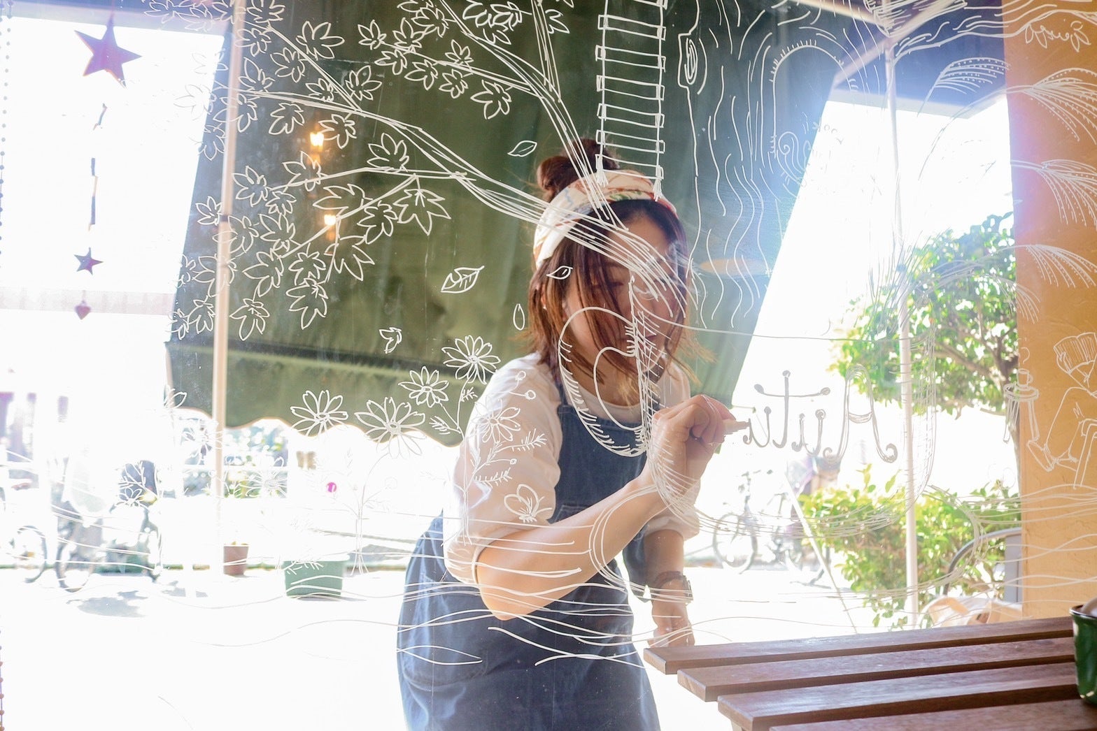 Café de Lien*の大きなガラスのショーウィンドウをキャンバスに、春夏秋冬・季節感あふれるイラストを描くゆかさん。下書きなしにペン一本、どんどん想像の世界が描き出される様子はまるで魔法のようです。