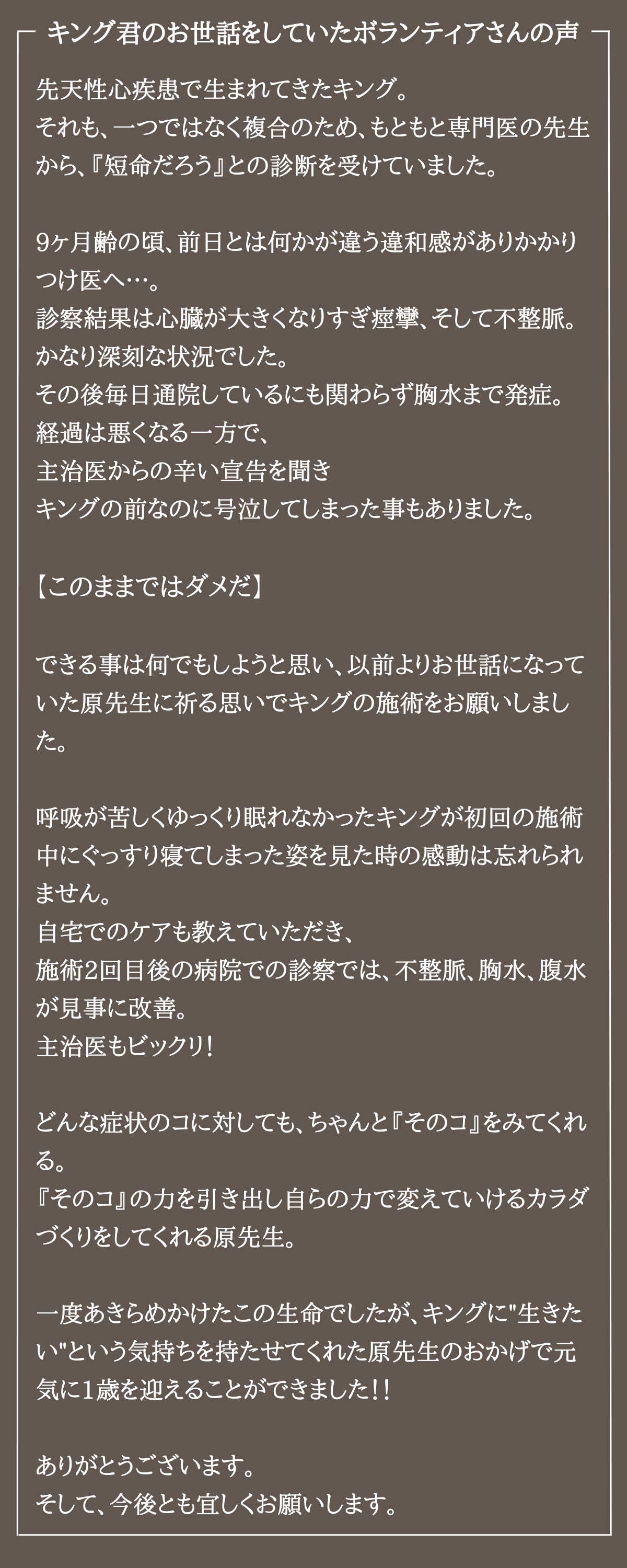 整体を終えた直後、横になり眠った様子のキング君を見て一安心したことを覚えています。その後、キング君は現在も腹水はあるもの元気に生活を送っています。