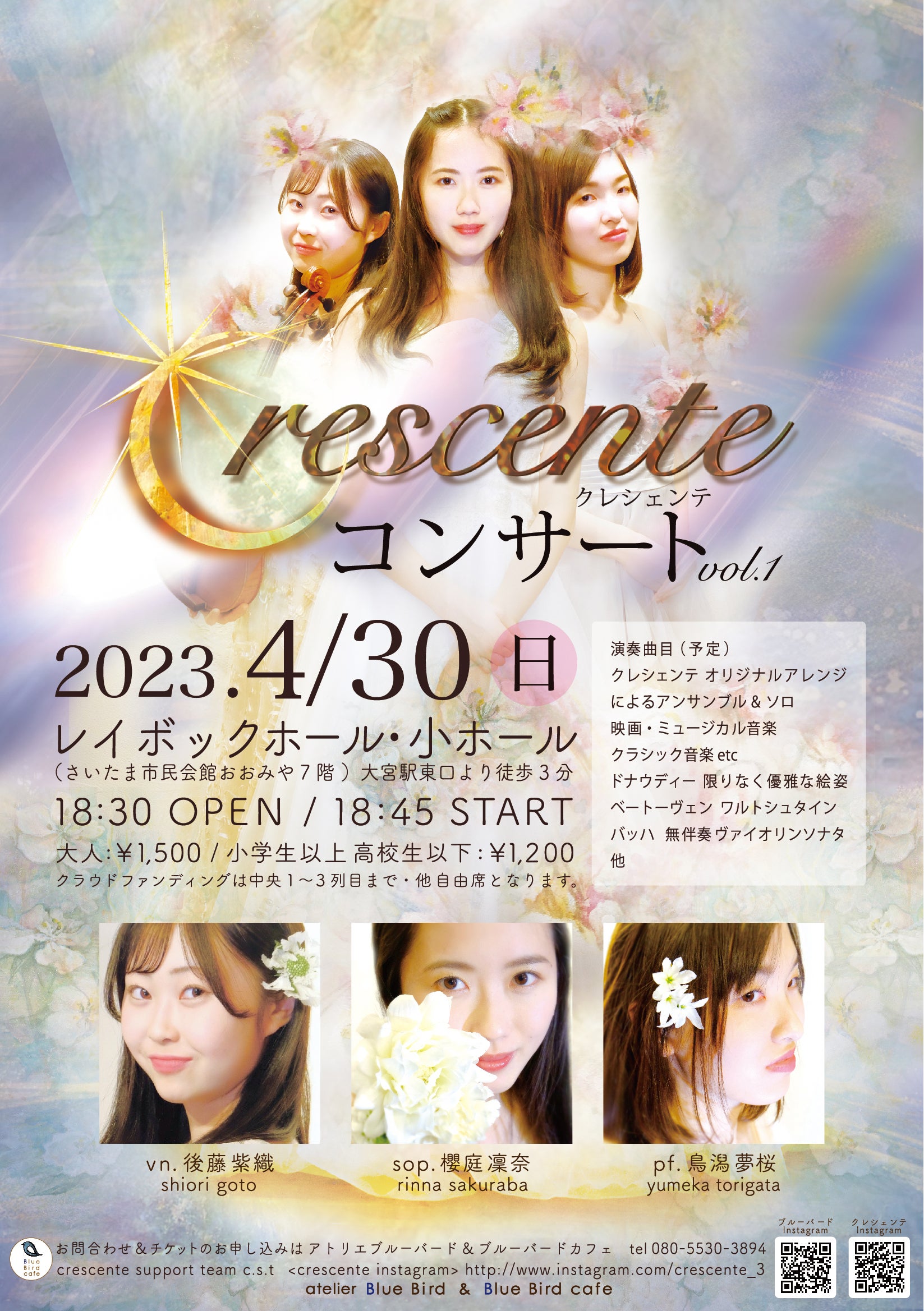 そしてこの度、Crescente〜クレシェンテ〜を支持していただけるお客様の応援があり、クレシェンテコンサートをホームであるブルーバードカフェから大宮レイボックホール・小ホールに場所を移して開催することになりました。彼女たちのエネルギッシュな演奏が、小さなブルーバードカフェでは収まりきらなくなったこと、またお客様が入りきらなくなった為です。