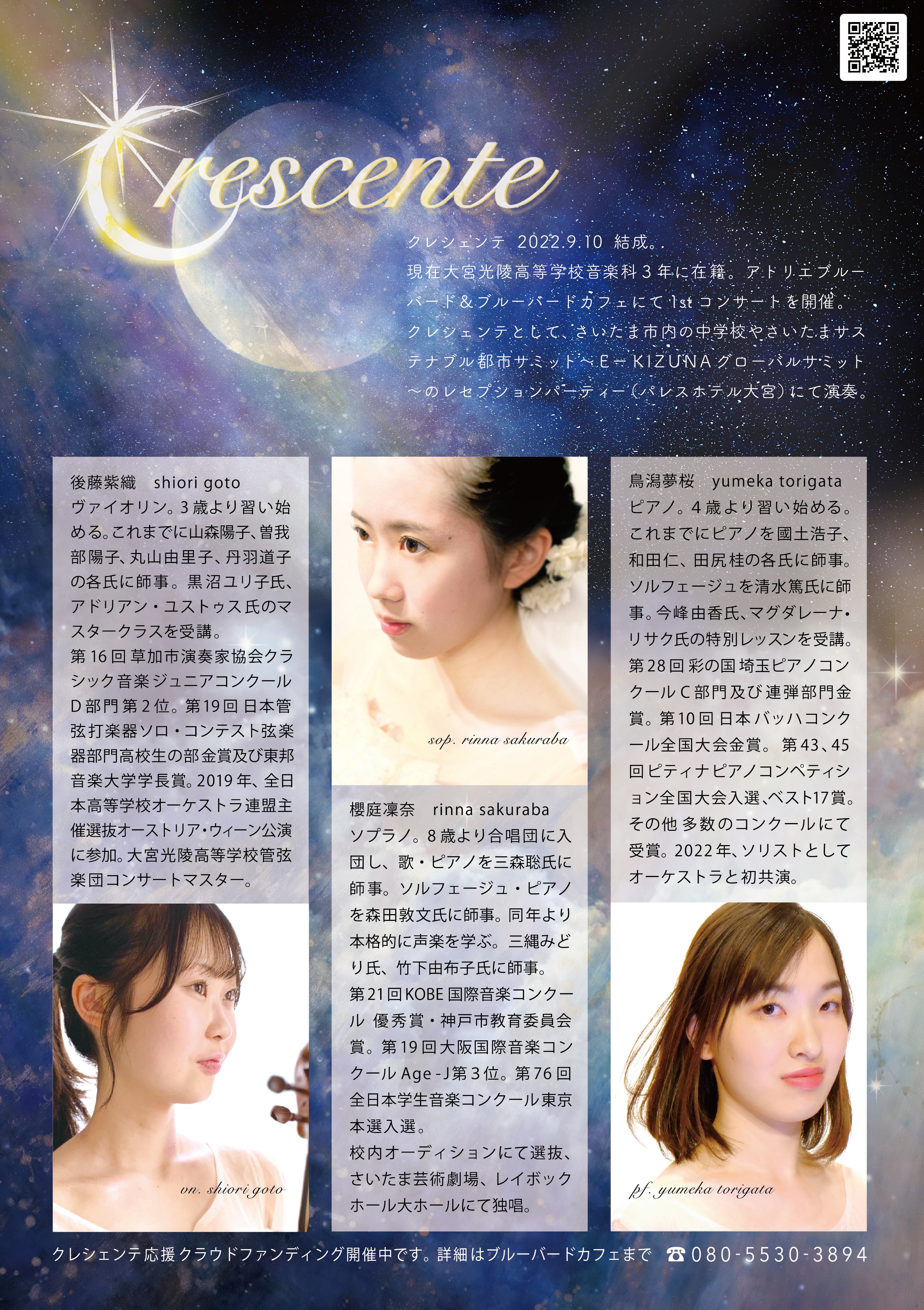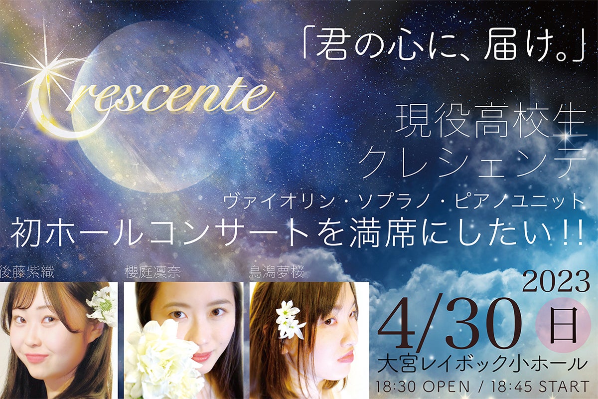 Crescente〜クレシェンテは高校生3人によるユニットです。彼女たちの心にある平和・夢・癒し・チカラを、思う存分表現します。音楽と向き合う、フレッシュな歓びがそこにはあります。純粋に世界を輝かせたい!!世界を笑顔でいっぱいにしたい!!という思いがそこにはあります。そんな彼女たちの輝き溢れるコンサートを、どうそ会場でお聴きください!!!