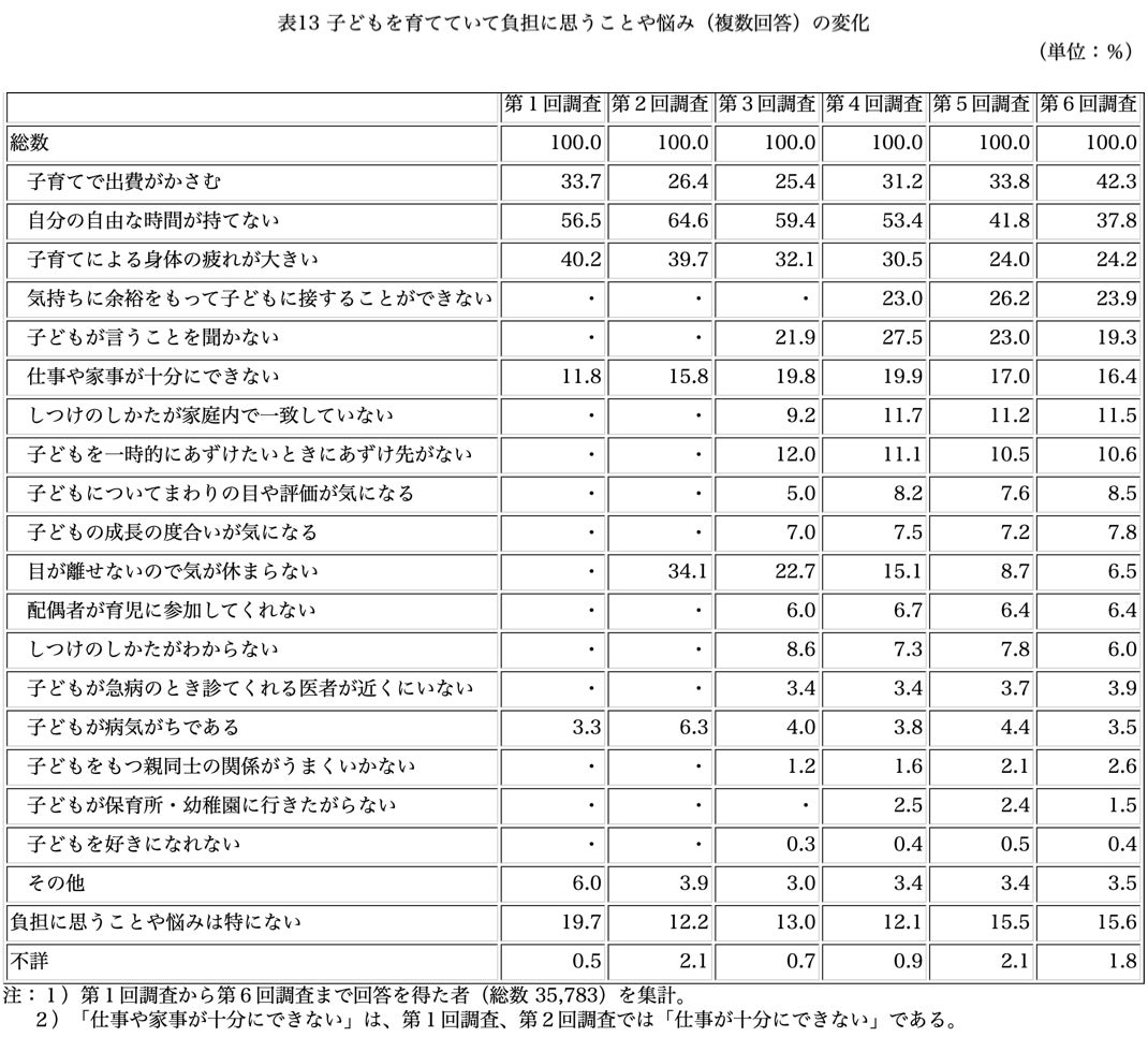 出典:厚生労働省ホームページ https://www.mhlw.go.jp/toukei/saikin/hw/syusseiji/06/kekka3.html厚生労働省のホームページによると、「子どもを育てていて負担に思うことや悩み」として