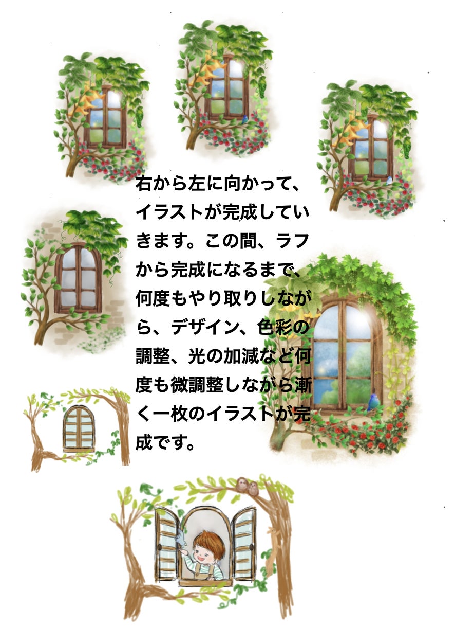上のイラストでは、小鳥の向き、色彩に何度も修正が入りました。