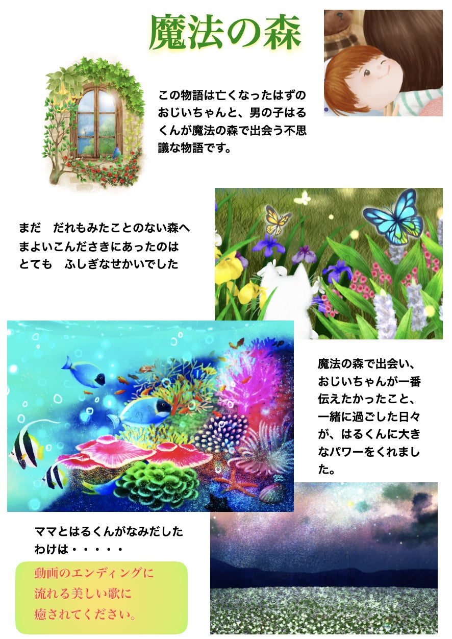 ・動画『魔法の森』のエンディングと絵本に協賛企業としてお名前を掲載する事ができます。