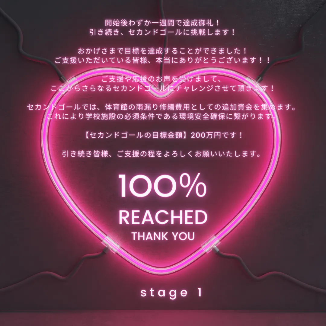 この先、セカンドステージにて体育館の雨漏り含む内外装修繕の追加支援に伴い、改めてお願い申し上げます。