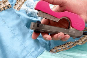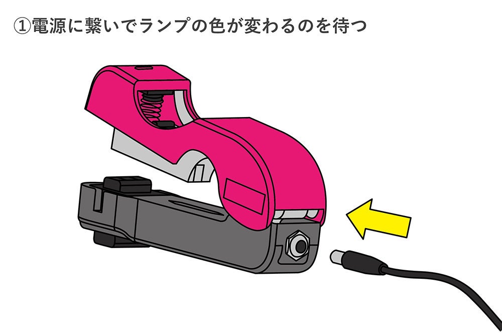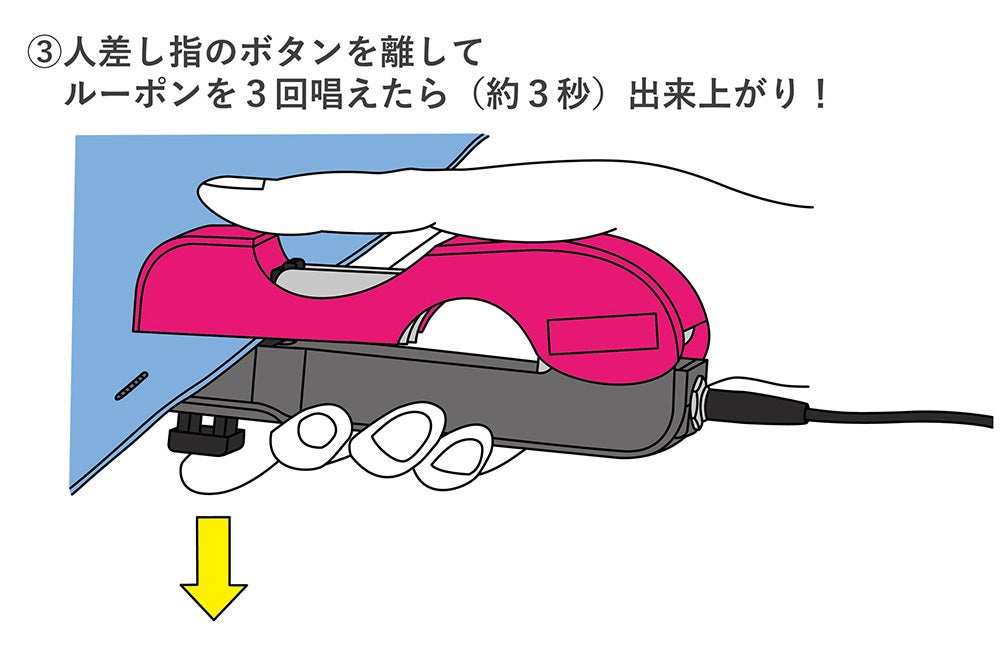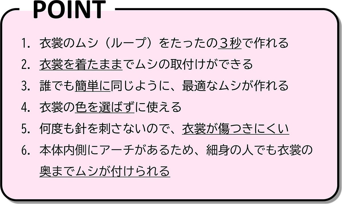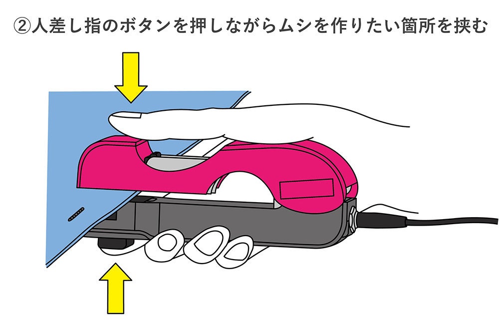 ムシを取付けたい箇所を挟むことで、樹脂製の針が衣裳を貫通し、両端を熱で溶かしてループ状にすることにより、誰でも簡単にムシを作れる装置です!