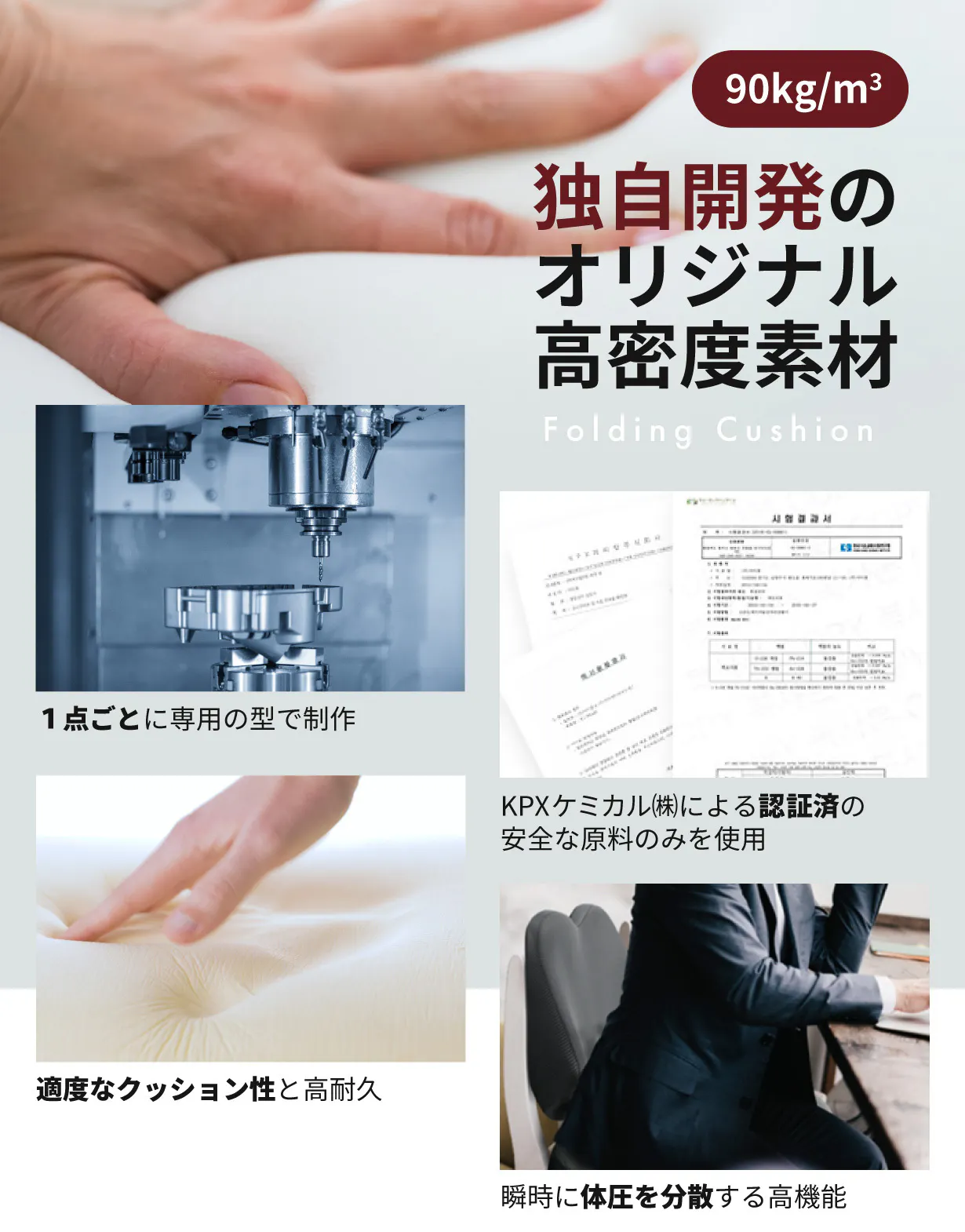 機能性クッションで最も重要な選択の基準は、フォームの材質です。同じメモリーフォームも成分配合により、品質は千差万別です。メモリーフォーム機能クッションは、硬すぎても柔らかすぎても良くありません。「Folding Cushion」では 独自開発のオリジナル高密度素材 のVISCOFOAMを使用。お尻と骨盤、太ももに加わる圧力を均等に分散・吸収し、安定して正しい姿勢を保つことが出来ます。