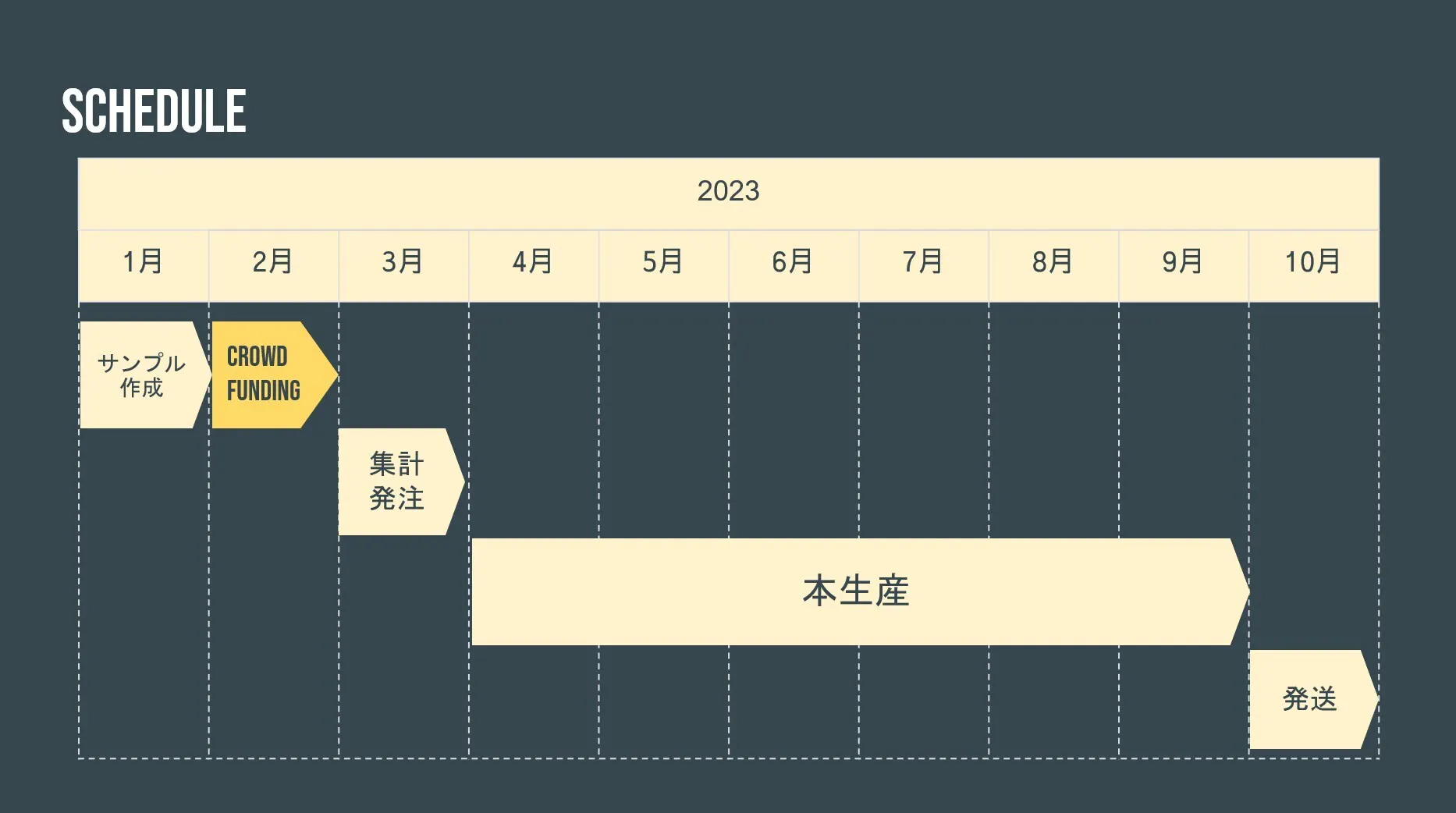 以下のスケジュールで進行しています。クラウドファンディング完了後、3月に発注、気温の下がり始める10月頃に配送を予定しています。