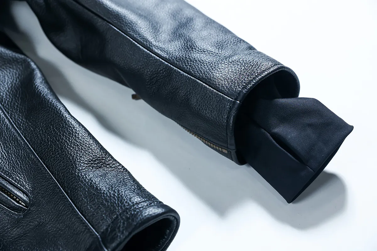 そしてDarkのレザージャケットはライダーの要件も担保しています。まずはレザーはバイカープロダクトにおいて定番の「カウ」レザー。しかしながらなるべく柔らかいものを使っています。