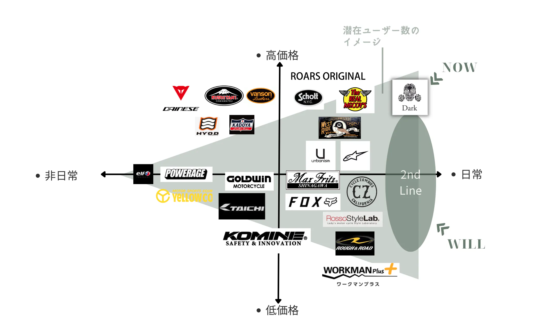 立ち位置としては以下のようなイメージです。バイク衣類は、もっと普段使いがあっていいと考えています。