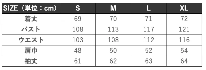 S、M、L、XLがございます。リターン購入時、以下のサイズチャートをもとにお好みのサイズをお知らせください。