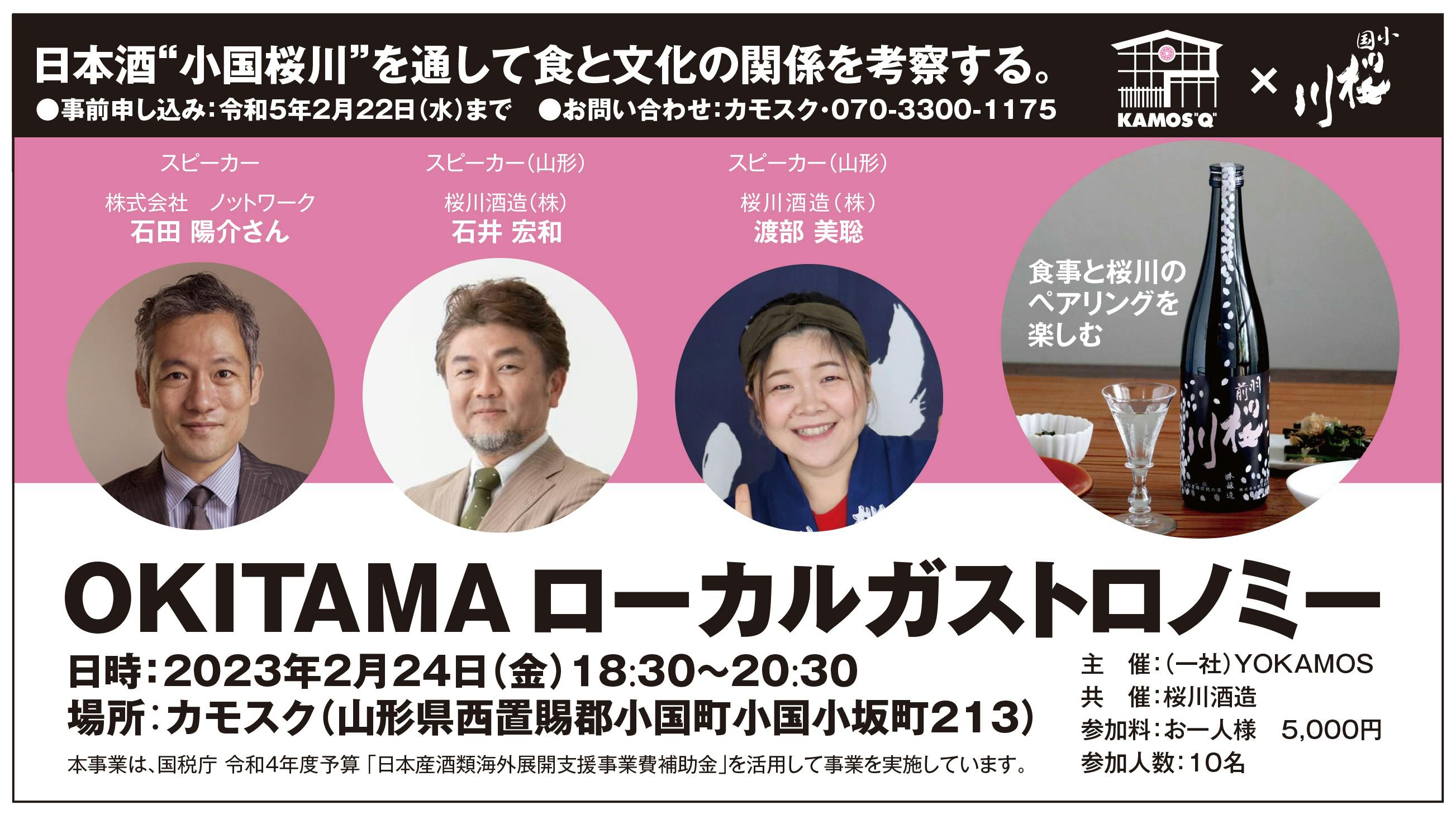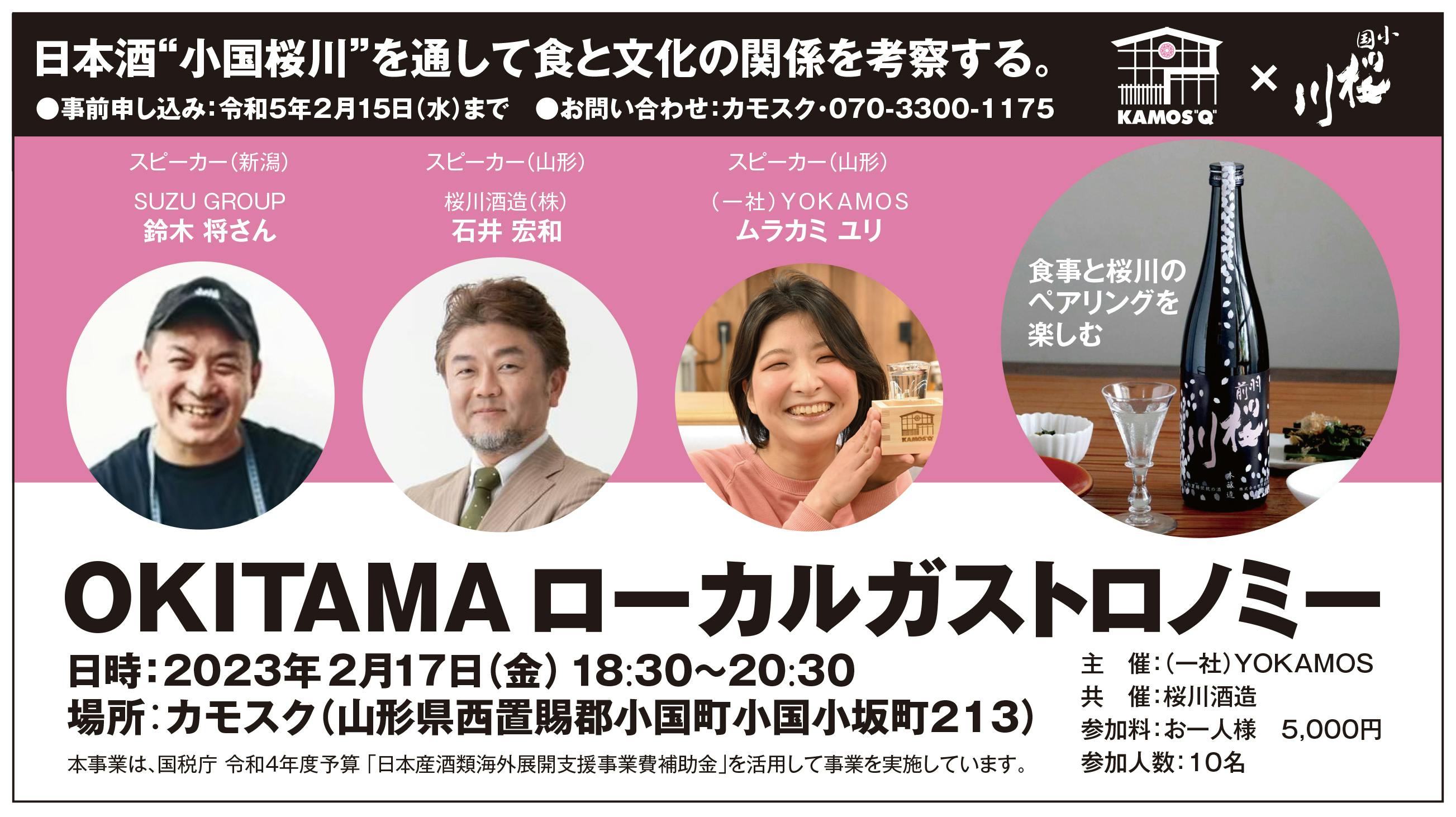 また、SUZUGROUPオーナーシェフ食文化プロデューサーの鈴木将さん(YOKAMOS経営陣)や石田陽介さんをはじめとしたソムリエ・唎酒師の方と一緒に「小国桜川」の新しい楽しみ方、料理・ペアリングの機会をカモスクで創っていきます。酒蔵ツーリズムとも呼ばれる活動を展開していきます。ここで2月に企画しているイベントをご案内させて頂きます。