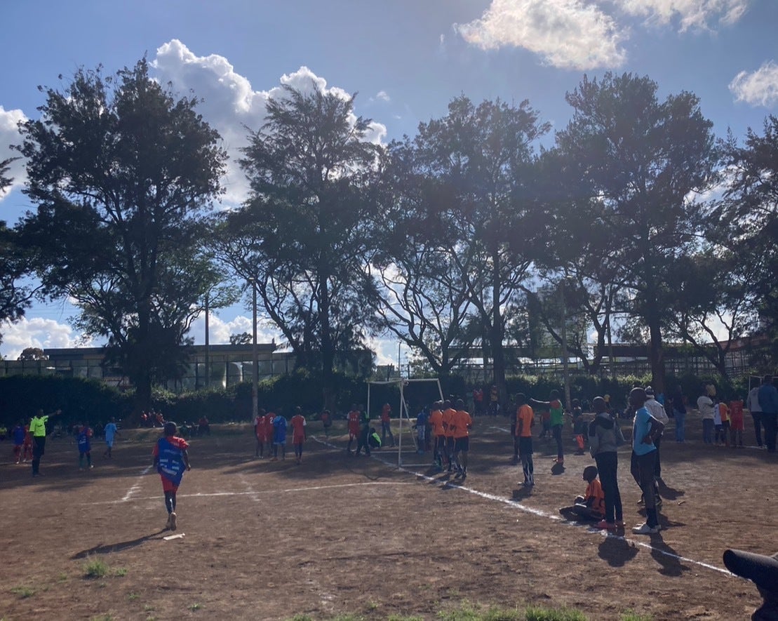TAKESHI SEO & JAPAN presents KIBERA A-GOAL LEAGUEでは、本来1面分のコートを年齢に合わせて2面か3面に区切って試合を行っています。そのため隣のコートで行っている試合のボールが入ってくることもしばしば。