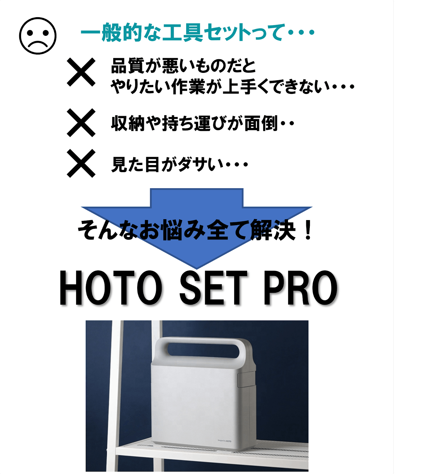 HOTO SET PROは、日常のDIYシーンで最も使用する基本的なツールを揃えた工具セットです。一家に一台あるだけで、家具の組立や家電の修理等、幅広いDIYに対応可能です。