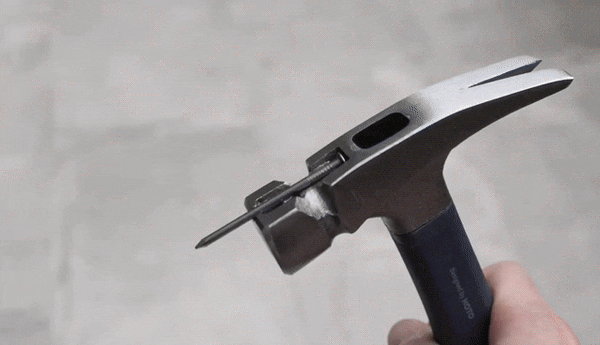 HOTO ネイルハンマーにはヘッド先端に釘を収められるスペースがあり、内蔵の磁石で釘を固定できるため、片手で簡単に釘打ちが可能です。