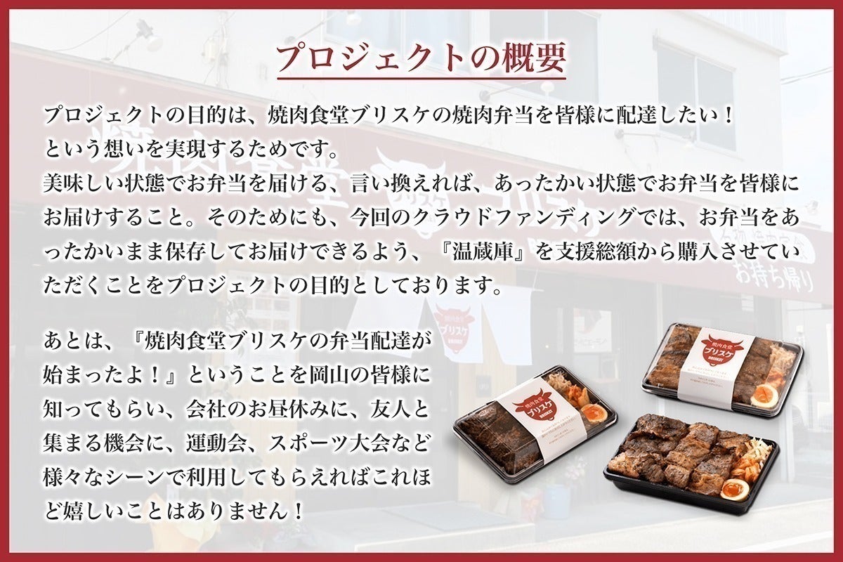 プロジェクトの目的は、焼肉食堂ブリスケの焼肉弁当を皆様に配達したい!