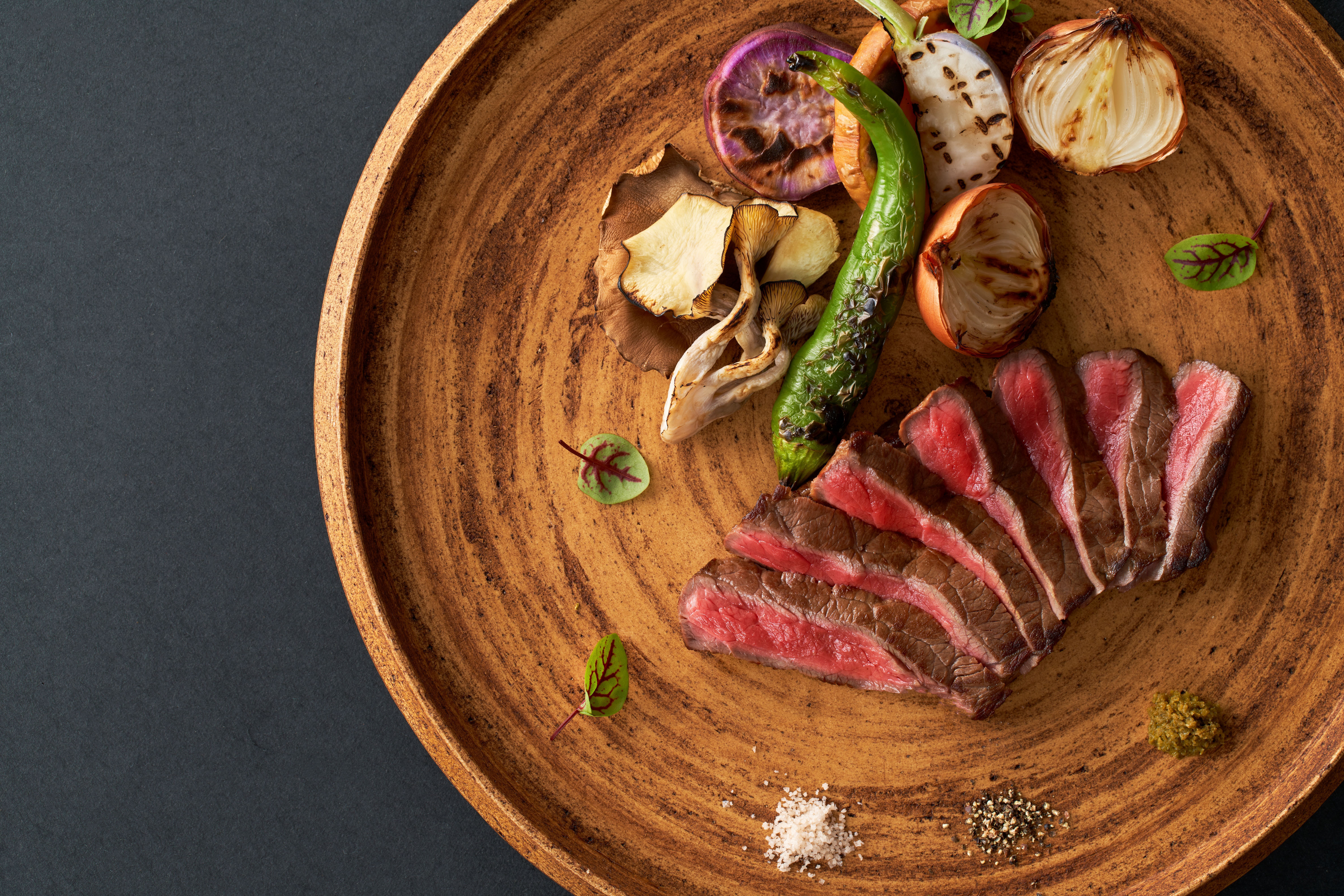 火入れの妙が試されるこの一品では、牛肉独自の口どけのまろやかさを最大限に生かすことを念頭に、ほんとうに試行錯誤の末、和ハーブ仕立てと山椒仕立ての二種類を完成。