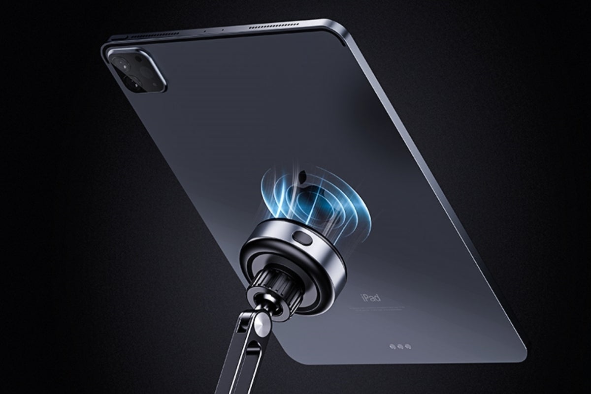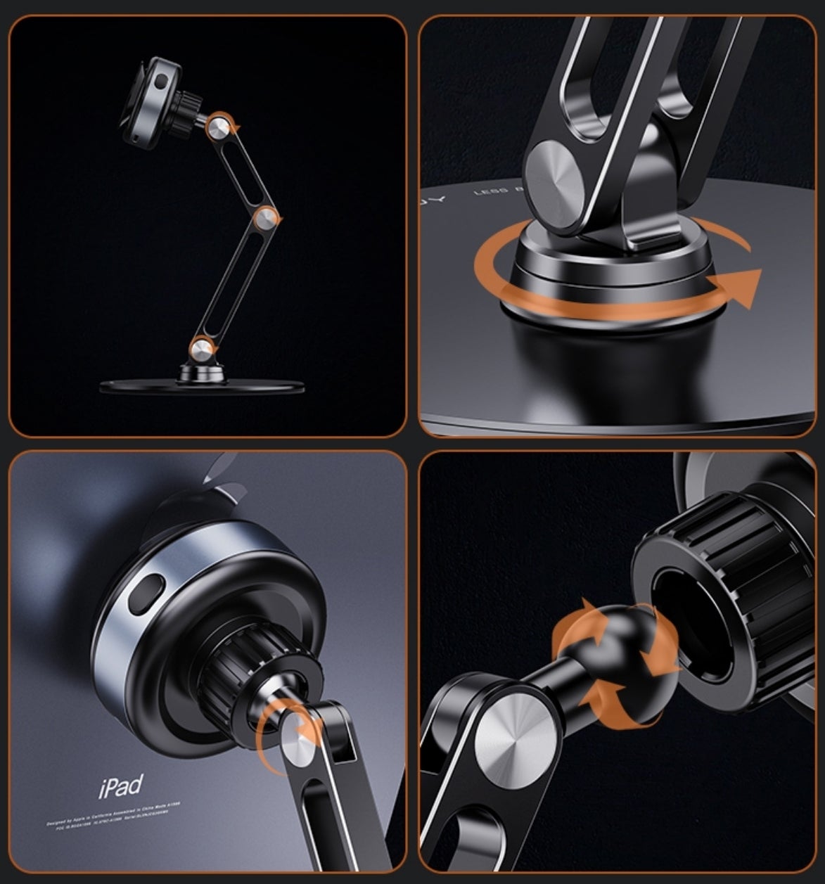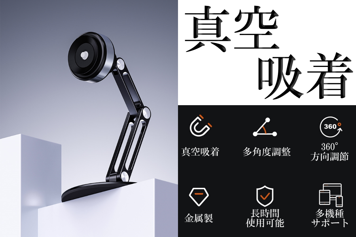 タブレットPCやスマホをスタンドに近づけるだけで自動的に真空吸着吸着するので脱着が簡単。本体は丈夫なアルミ合金製で、高さ調節・方向調節だけではなく角度調節も可能!
