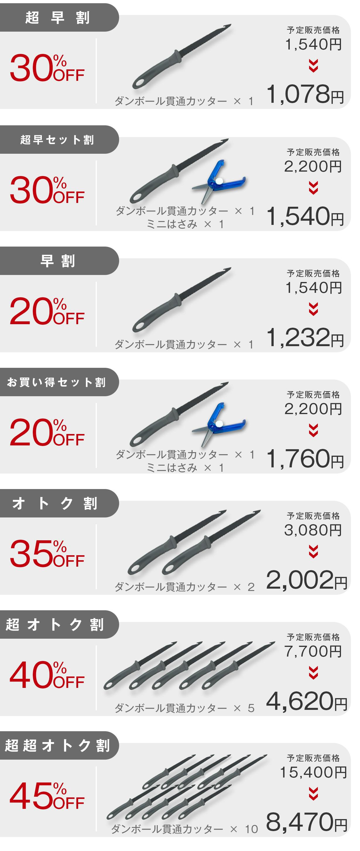 今回リターンとして、上記の特別仕様のミニハサミとダンボール貫通カッターのセットがございます。