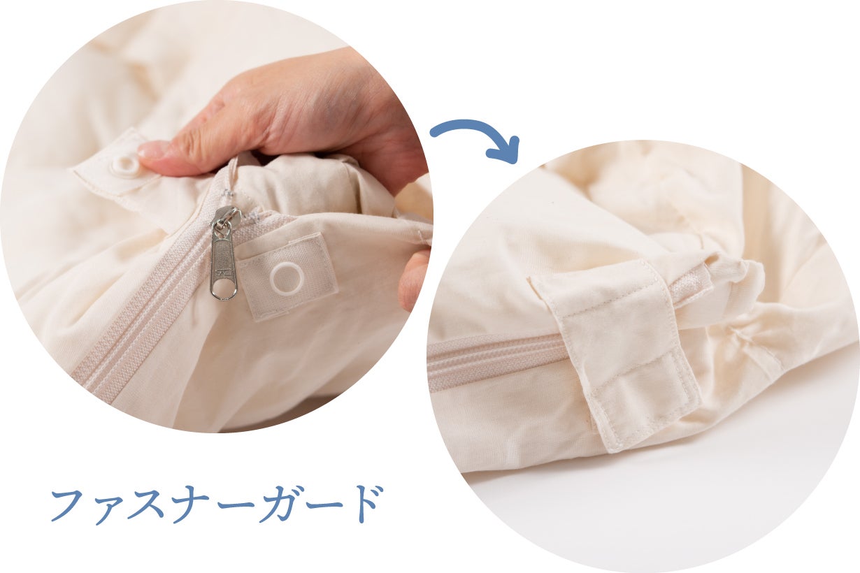 また、使用中に髪の毛がファスナーに絡むのを防いだり、ファスナーが勝手に動かないためにファスナーガードも付属しています。