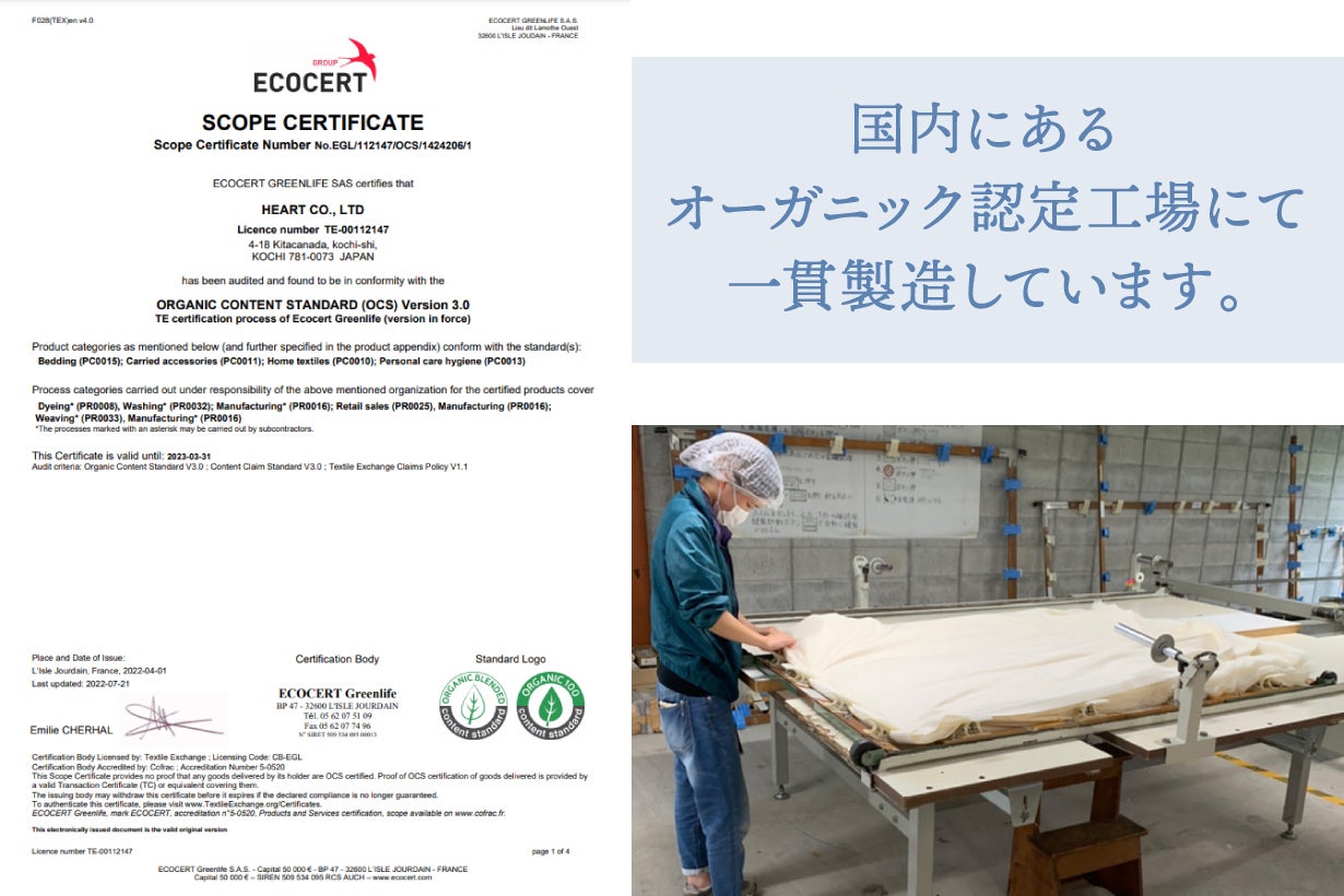 それは厳選された生地を使用し、縫い糸や品質表示、タグについても厳しい審査の通った素材を使用しております。この商品がオーガニック繊維製品であることを証明するマーク、国際認証OCS基準を満たした製品となります。