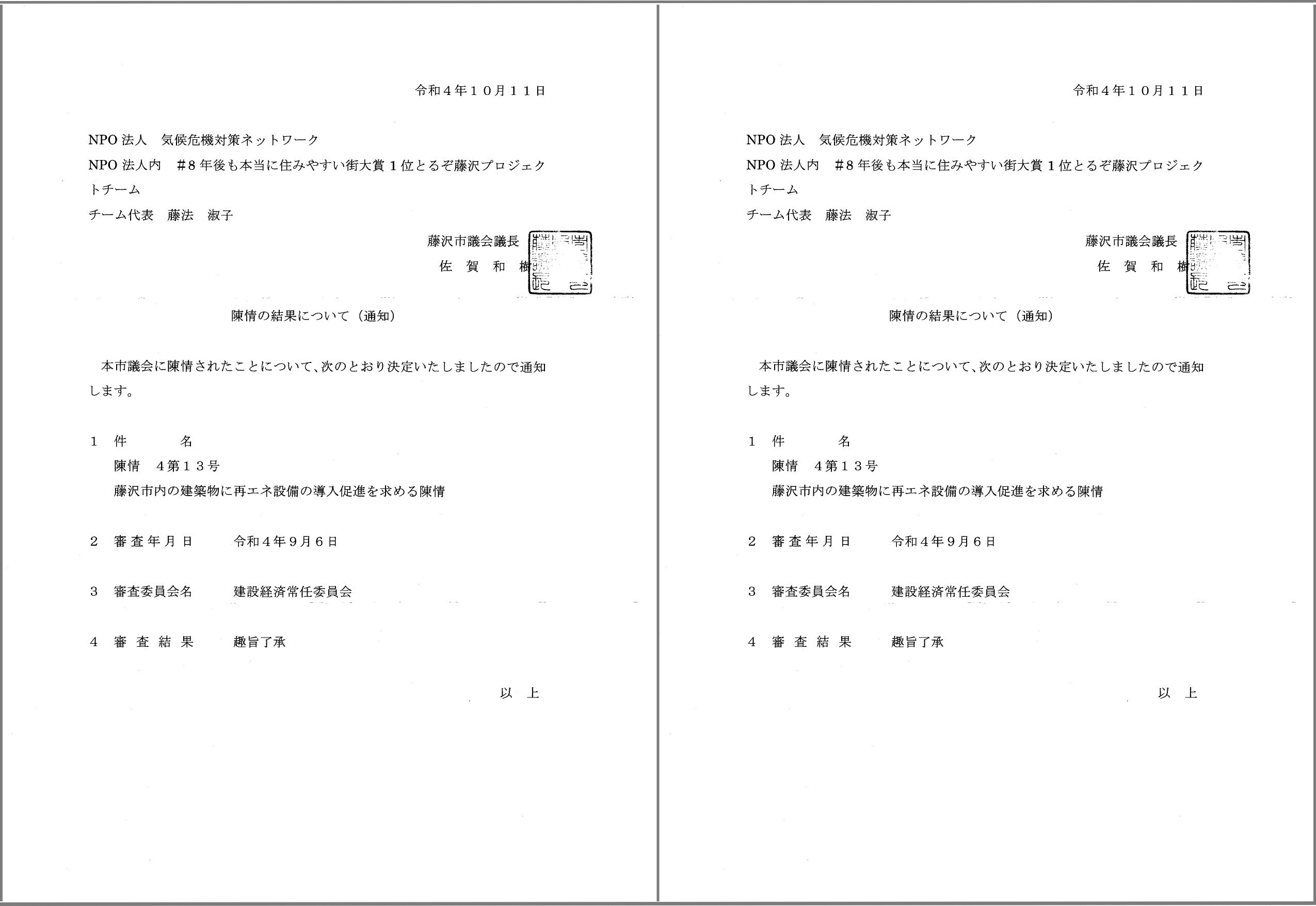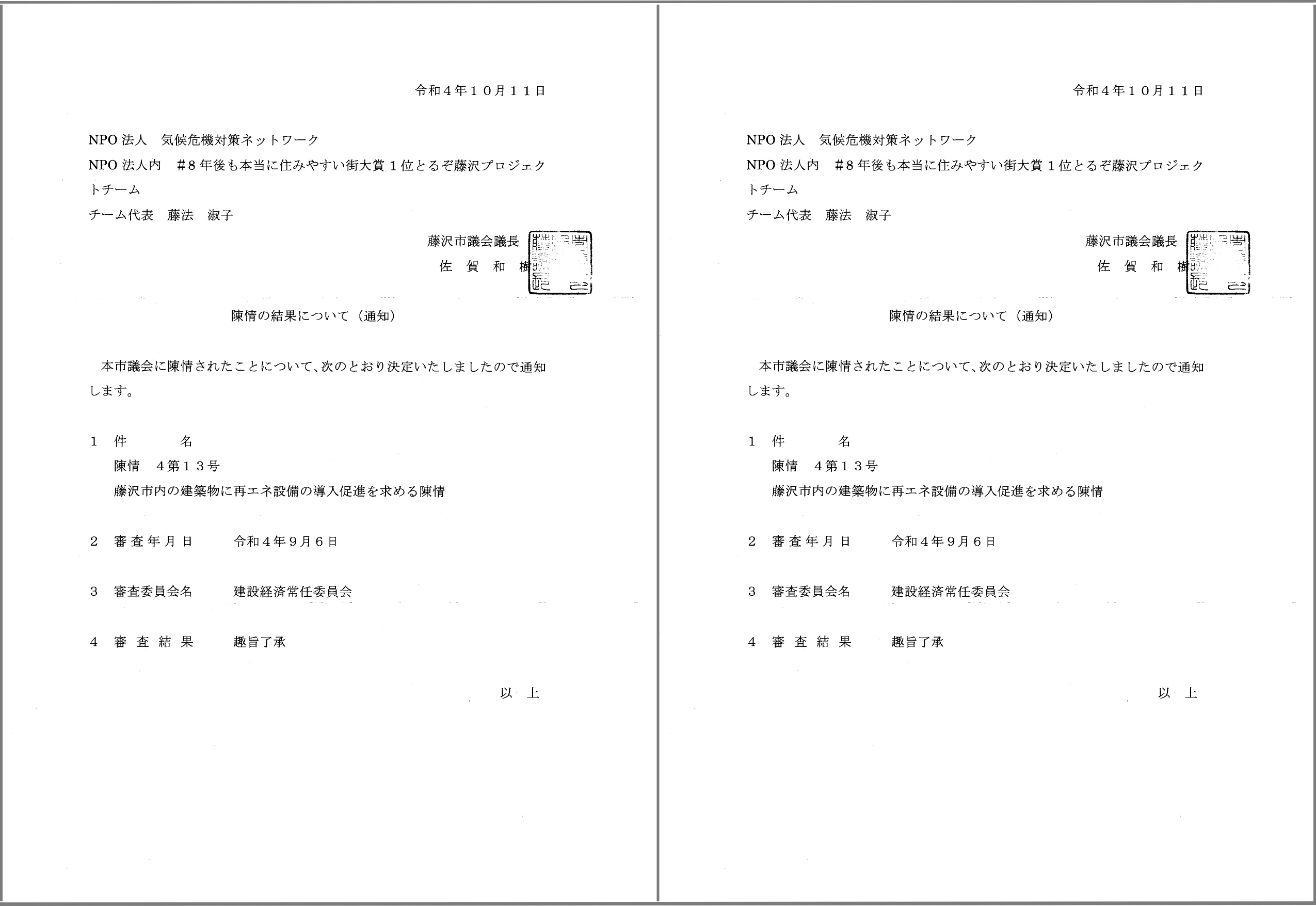 そして、2022年9月の藤沢市議会において「藤沢市内の公共施設の断熱性能の向上を求める陳情」と「藤沢市内の再エネ設備の導入促進を求める陳情」という2件の陳情を行いました。