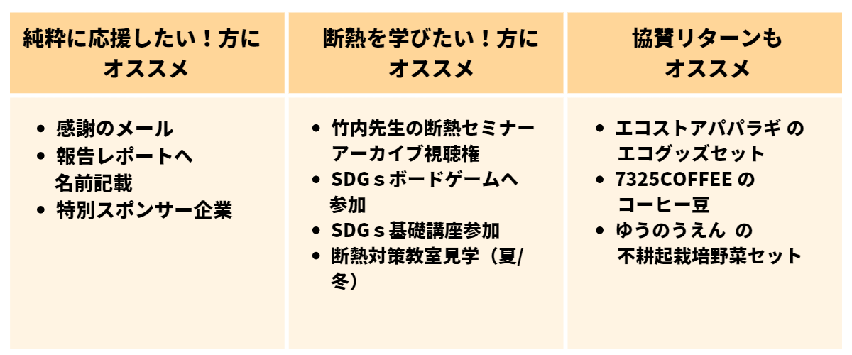 また、リターンの中には「断熱対策をした教室の見学招待」もご用意してます。(夏と冬の2回実施予定)