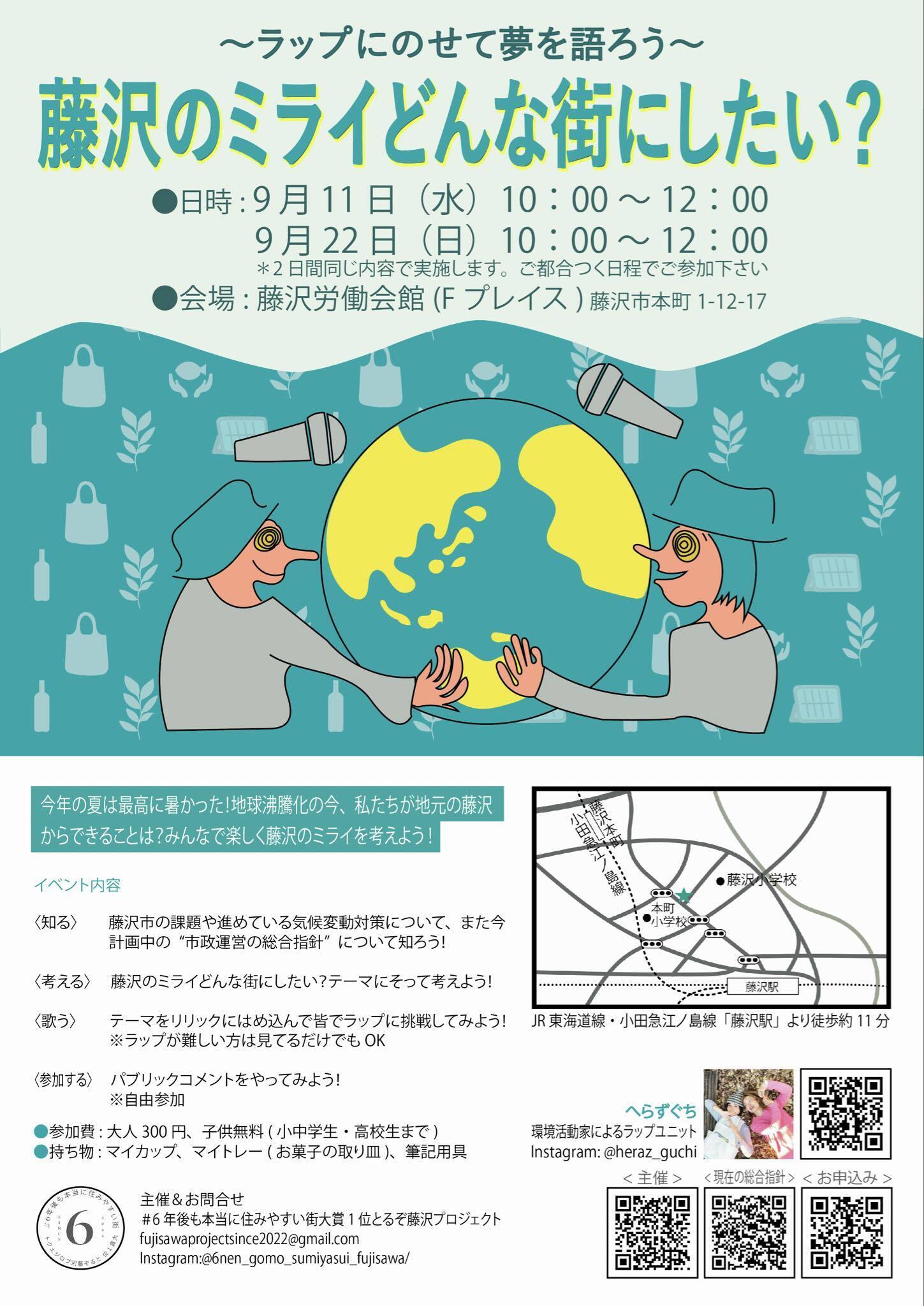 2024/09/01 08:00皆さん、こんにちは!ふじさわ学校断熱ワークショップ実行委員会の藤法です。8月は猛暑が続き、台風10号は日本列島を横断していますね。雨の被害があった地域にお住いの方もいらっしゃるかもしれません…。台風に限らず、豪雨災害が連続して起こっていますね…。藤沢市では令和7年度に新しい「藤沢市市政運営の総合指針」を策定します。この総合指針は市の方針を決める上位計画なので、街づくりの方針となります。現在、長期的な視点に関するアンケートを実施中です。ぜひ藤沢市外でも藤沢市に関心がある人はアンケートに回答してみてください!たくさんの意見が集まると、今よりもっと住みやすい街になるのではないでしょうか?何でも行政頼みではなく、自分たちで解決できることは進めていきたいと思いますが、災害に対する対策や、「建物の断熱化」を推進していくにはやはり行政が大切だなと感じます。この「藤沢市市政運営の総合指針」の策定に合わせて、では「どんな街だと住みやすいんだろう?」と思い、実行委員会のメンバーである「#6年後も本当に住みやすい街大賞1位とるぞ藤沢プロジェクト」でイベントを企画しました。題して…「藤沢のミライどんな街にしたい?~ラップにのせて夢を語ろう~」〈詳細〉◆9月11日(水)10:00~12:00◆9月22日(日)10:00~12:00※2日間同じ内容です ※要予約★申込フォーム:https://forms.gle/y91Ckbz8eMZTsNEg8場所:藤沢労働会館(Fプレイス)304会議室参加費:大人300円 子ども無料(小中学生・高校生まで)主催:#6年後も本当に住みやすい街大賞1位とるぞ藤沢プロジェクト〈どんなことするの?〉イベントではみんなが住んでいて感じてる「困りごと」を出しあい、出てきたキーワードを使って「藤沢のミライ」をラップにするワークを行います。※ラップは「へらずぐち」のお二人が担当します。(9月22日(日)は二人とも参加)楽しく和気あいあいと話あいたいので、お茶あり、お菓子あり、子どもも参加OKのイベントです!(ラップをうたうのにハードルがあれば、困りごと共有と歌詞をつくるところだけ参加してもらってもOKです)藤沢市に住んでるかた、お近くの方、気になるかた、おともだちを誘ってぜひきてくださいね。引き続き断熱に関しても活動を続けていきます!応援宜しくお願い致します。 もっと見る