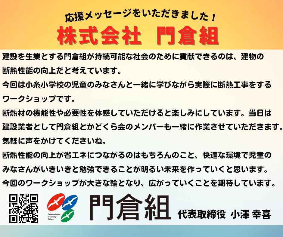 嬉しい応援メッセージをいただきました!藤沢で110年、街づくりに携わってこられている「株式会社 門倉組」の代表取締役 小澤幸喜様より応援メッセージをいただきました。「建設を生業とする門倉組が持続可能な社会のために貢献できるのは、建物の断熱性能の向上だと考えています。今回は小糸小学校の児童のみなさんと一緒に学びながら実際に断熱工事をするワークショップです。断熱材の機能性や必要性を体感していただけると楽しみにしています。当日は建設業者として門倉組とかどくら会のメンバーも一緒に作業させていただきます。気軽に声をかけてくださいね。断熱性能の向上が省エネにつながるのはもちろんのこと、快適な環境で児童のみなさんがいきいきと勉強できることが明るい未来を作っていくと思います。今回のワークショップが大きな輪となり、広がっていくことを期待しています。」門倉組様はワークショップ当日の作業も含め、教室の調査や資材の調達など、多くの部分をボランティアでご協力いただいております。子どもたちへの愛を感じるメッセージをありがとうございます!急にご相談させていただいた今回の断熱ワークショップの企画にすぐに賛同し、そして協力してくださる姿に地元・藤沢市に対する愛情をとても感じ、心強く感じております。SDGsの取組もHPに掲載されており、子どもたちの未来に向けた取組がとても素敵だと思いました。株式会社 門倉組地元の皆様と協力できること、とても嬉しいです!引き続き応援よろしくお願い致します。