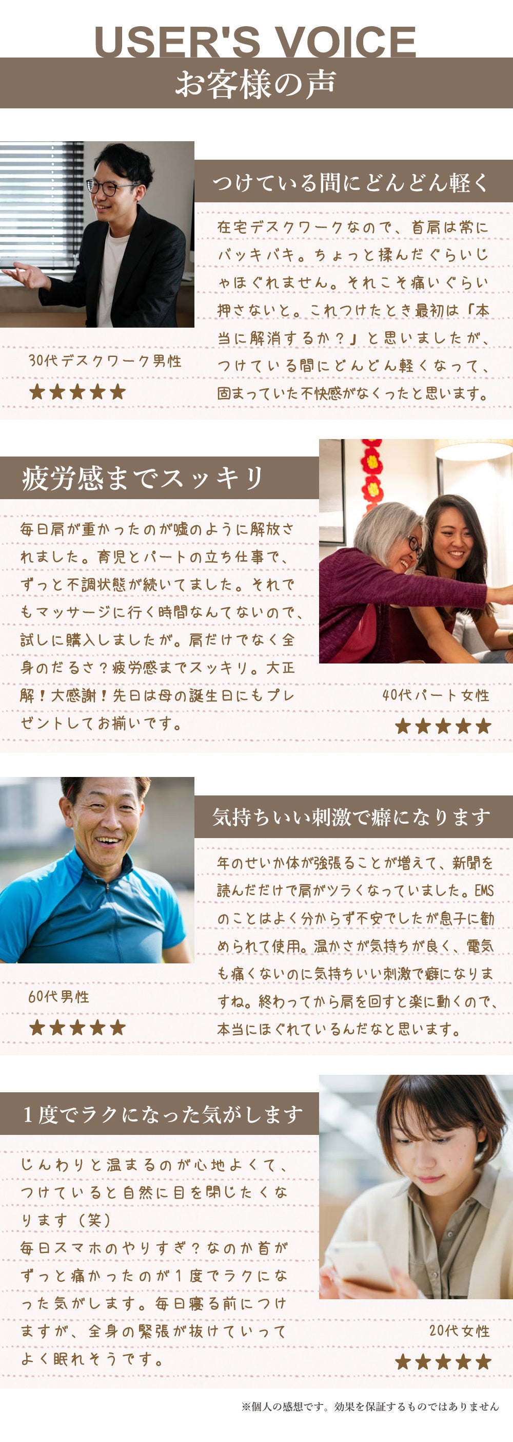 ・心臓ペースメーカー等体内移植型医療電子機器、人工心肺等生命維持用医療電子機器、心電図スキャナー等着用型医療電子機器などの医療機器を使用している方、心臓に疾患をお持ちの方、妊娠・出産直後の女性はご利用をお控えください。その他、医療機関にて治療を受けている方は使用前にお医者様へご相談ください。・防水仕様ではないので、水洗いしないでください。・充電しながらのご使用はおやめください。・使用中または使用後に痛みや不快感を感じたり、かゆみ、やけどなどの異常がある場合や、直ちに使用を中止し、医師に相談してください。・本製品を使用する時は、アクセサリー類を外してください。事故や怪我、破損の原因になります。・電極部に金属を接触させないでください。・乳幼児や小さなお子様に本製品を使用させたり、遊ばせたりしないでください。・商品を廃棄する場合は、お住まいの自治体の廃棄方法に従って捨てて下さい。※本製品は医療機器ではありません。本製品は、一般家庭用の コードレスEMS (Electrical Muscle Stimulation) 温熱 運動器(雑貨)です。