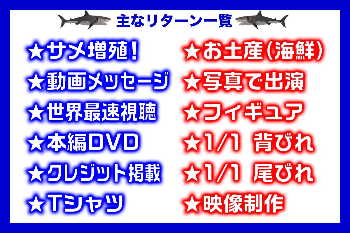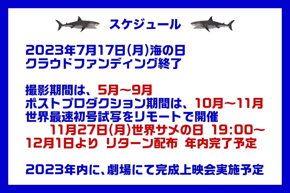 また、サメ映画マニアの方にはおなじみの サメ映画ルーキー 氏のお力添えをいただき、完成した作品は日本国内でのイベントや上映はもちろん、英語字幕をつけることで国内外の映画祭出品と海外市場でのソフト流通を行う予定です。