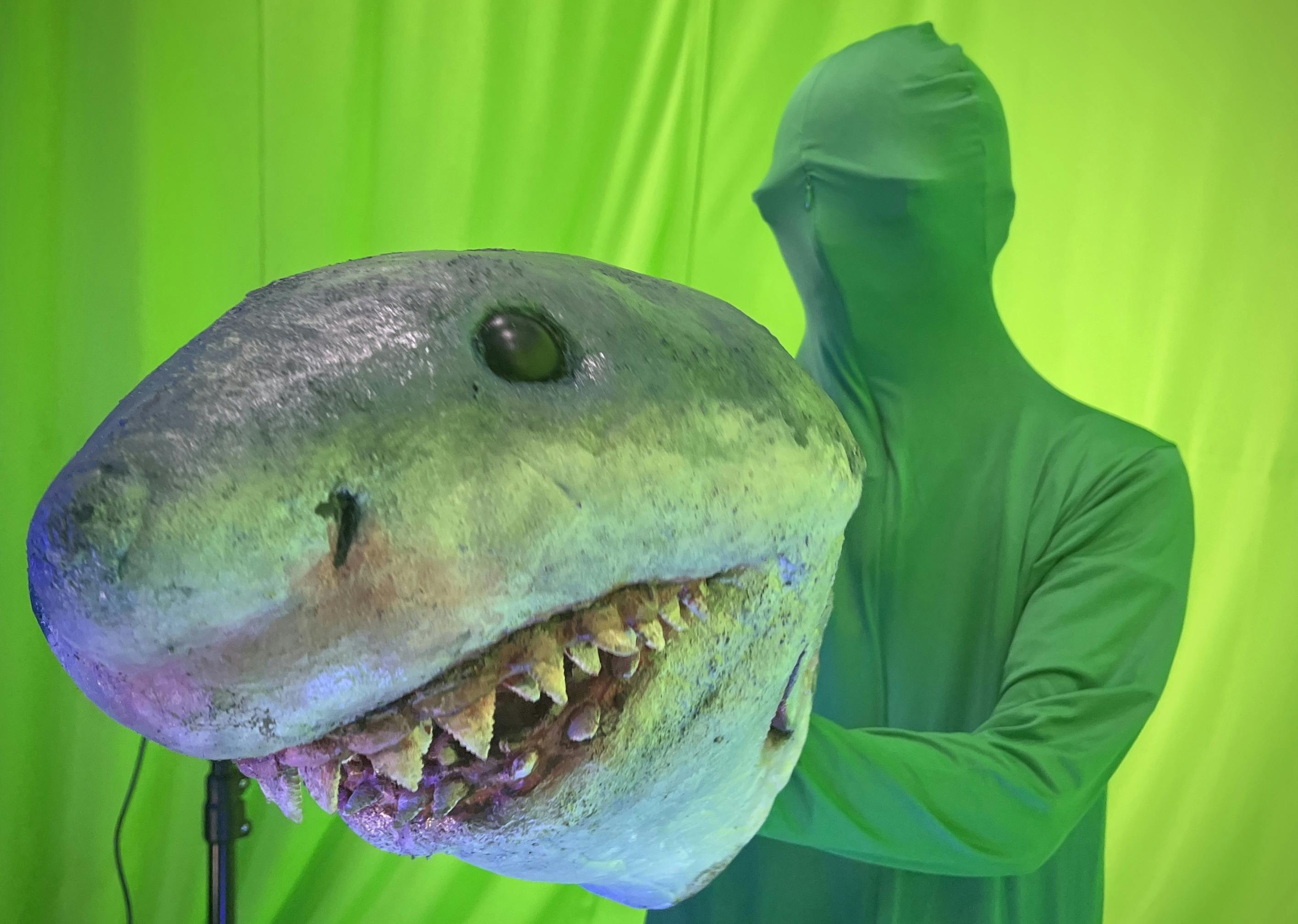 都内スタジオにて、グリーンバックにて合成用の素材撮影をいたしました。温泉シャークの頭を造形しまして、使用しました!