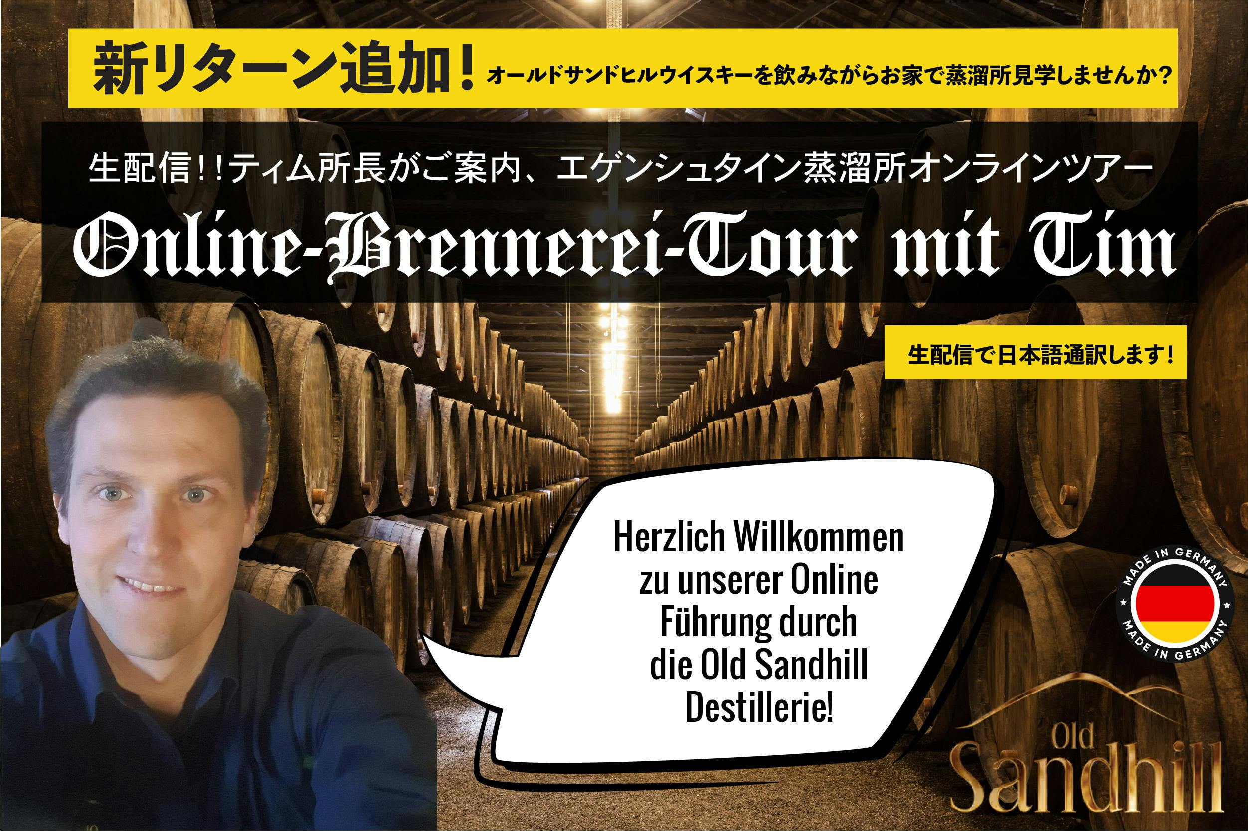 今回エゲンシュタイン蒸溜所のティム所長のご協力を頂き、所長自ら蒸溜所内を案内し、蒸溜所内の設備や熟成樽、自慢のオールドサンドヒルウイスキーの説明などを、なんと生配信でドイツと日本を繋ぎ、横浜からKING's BARREL(キングズバレル)の代表が全て生通訳しながらご覧いただけるオンライン蒸溜所ツアーを開催する事となりました!
