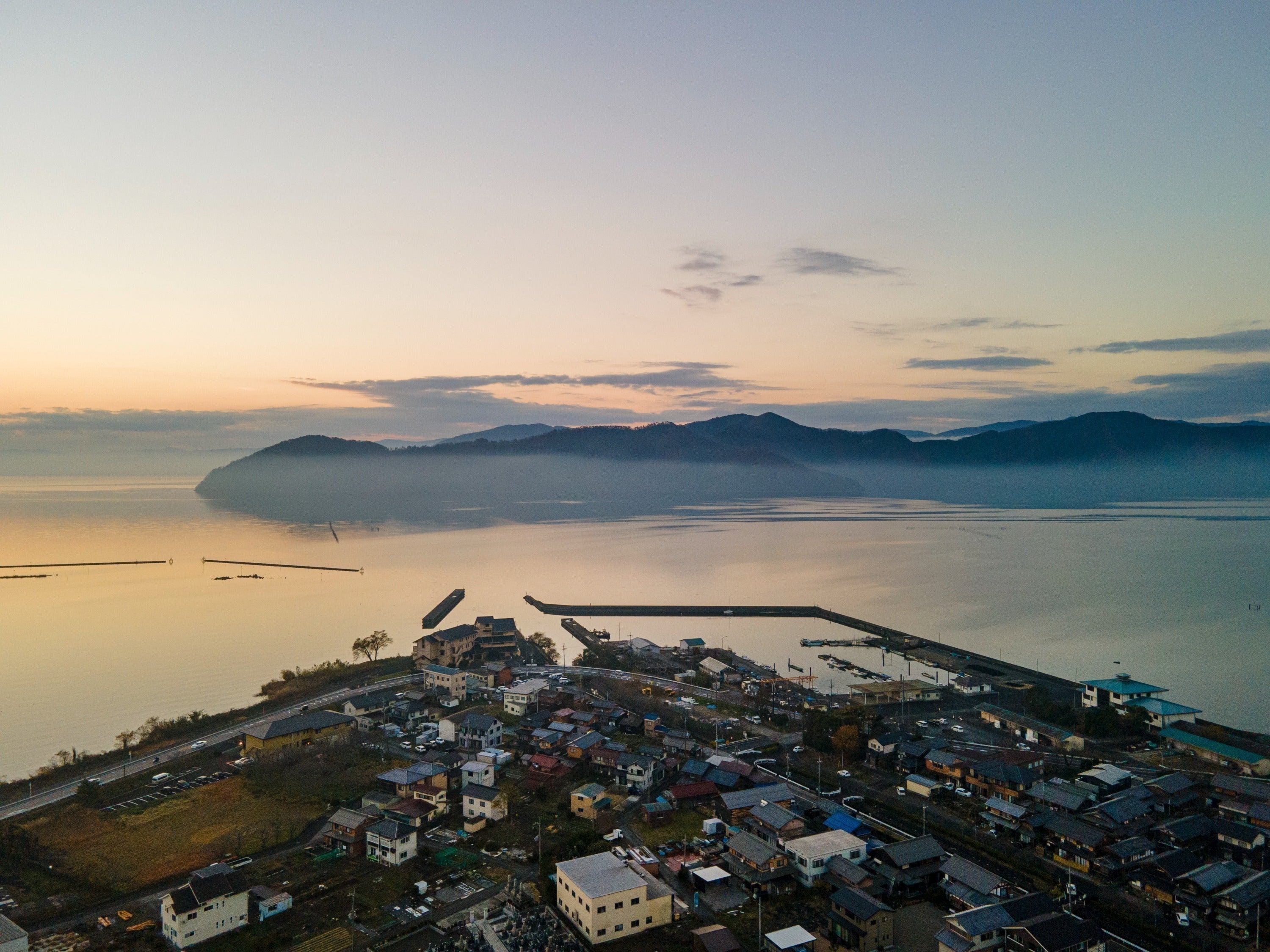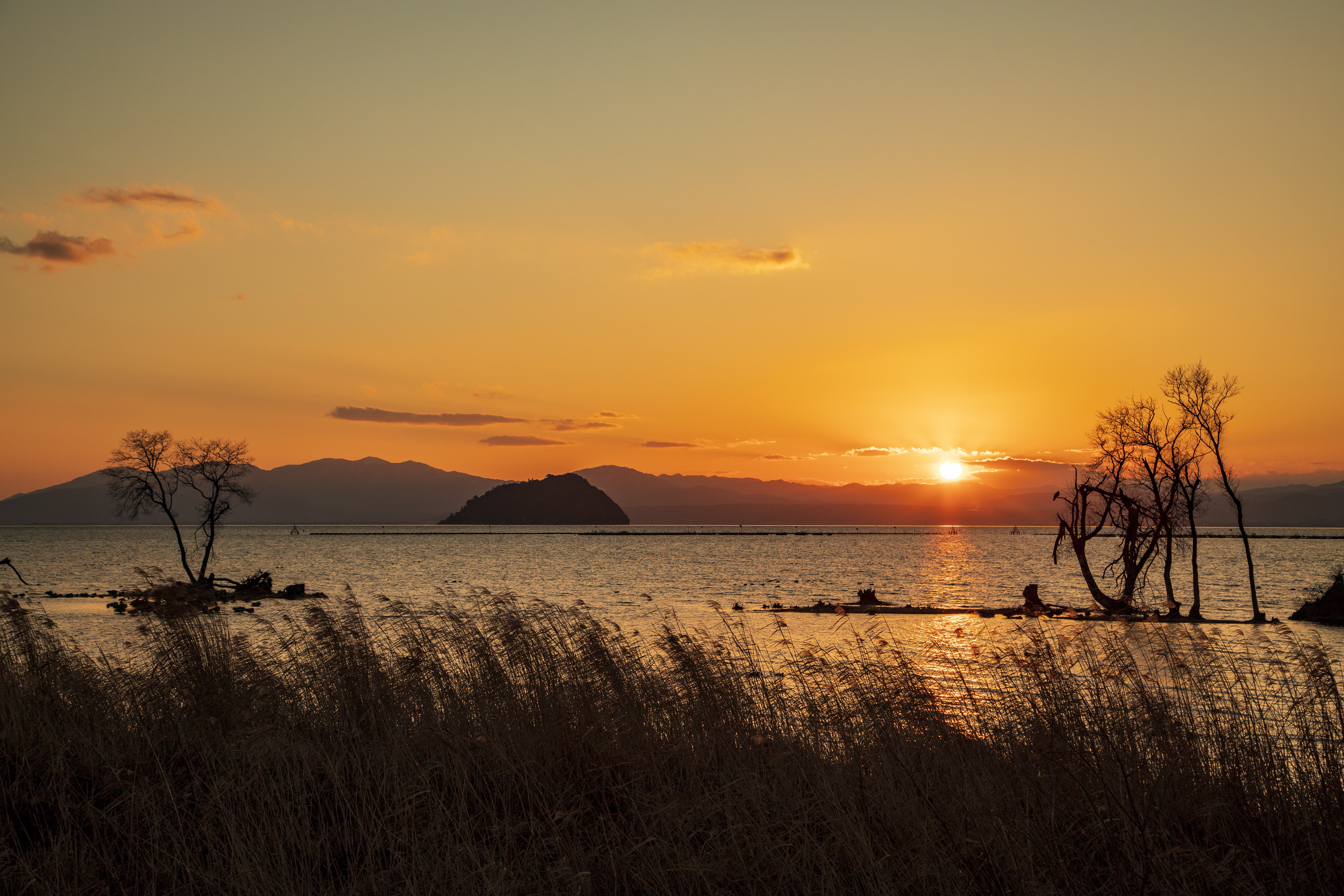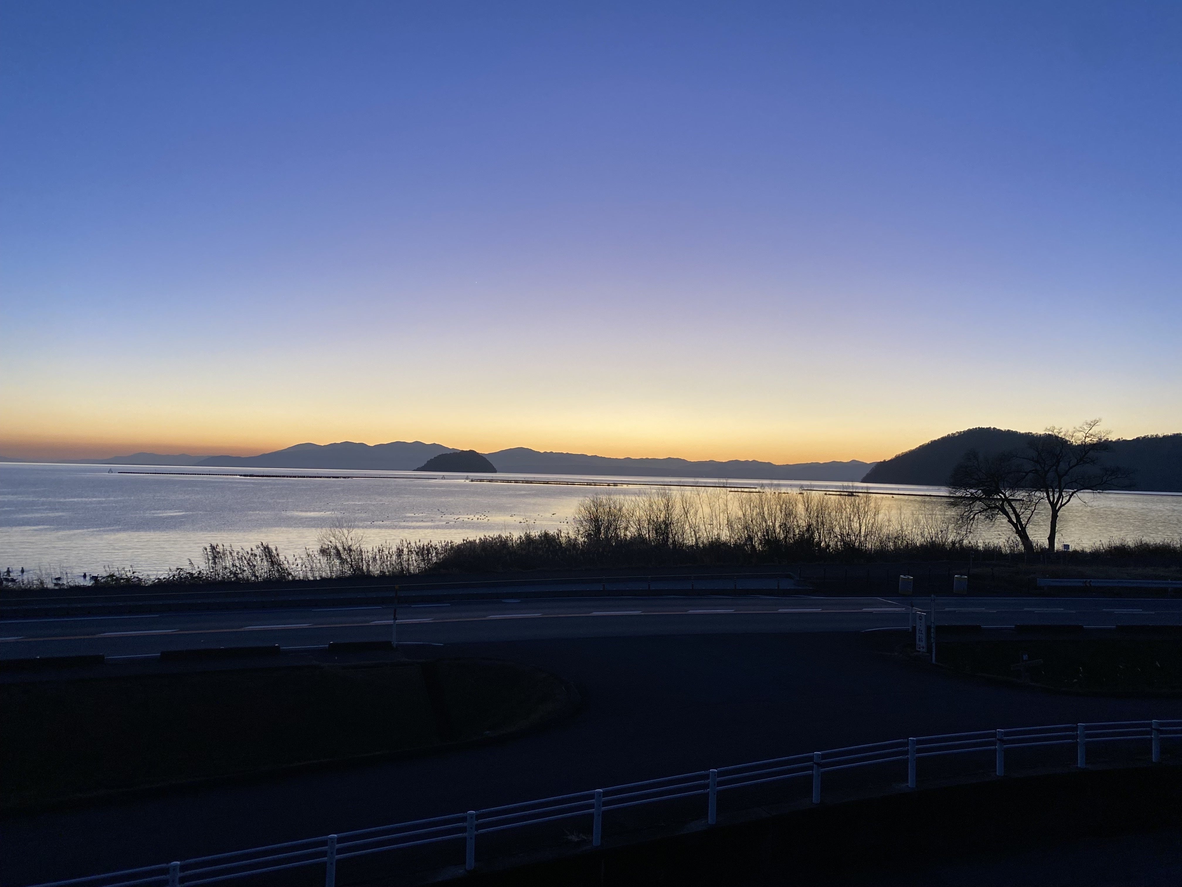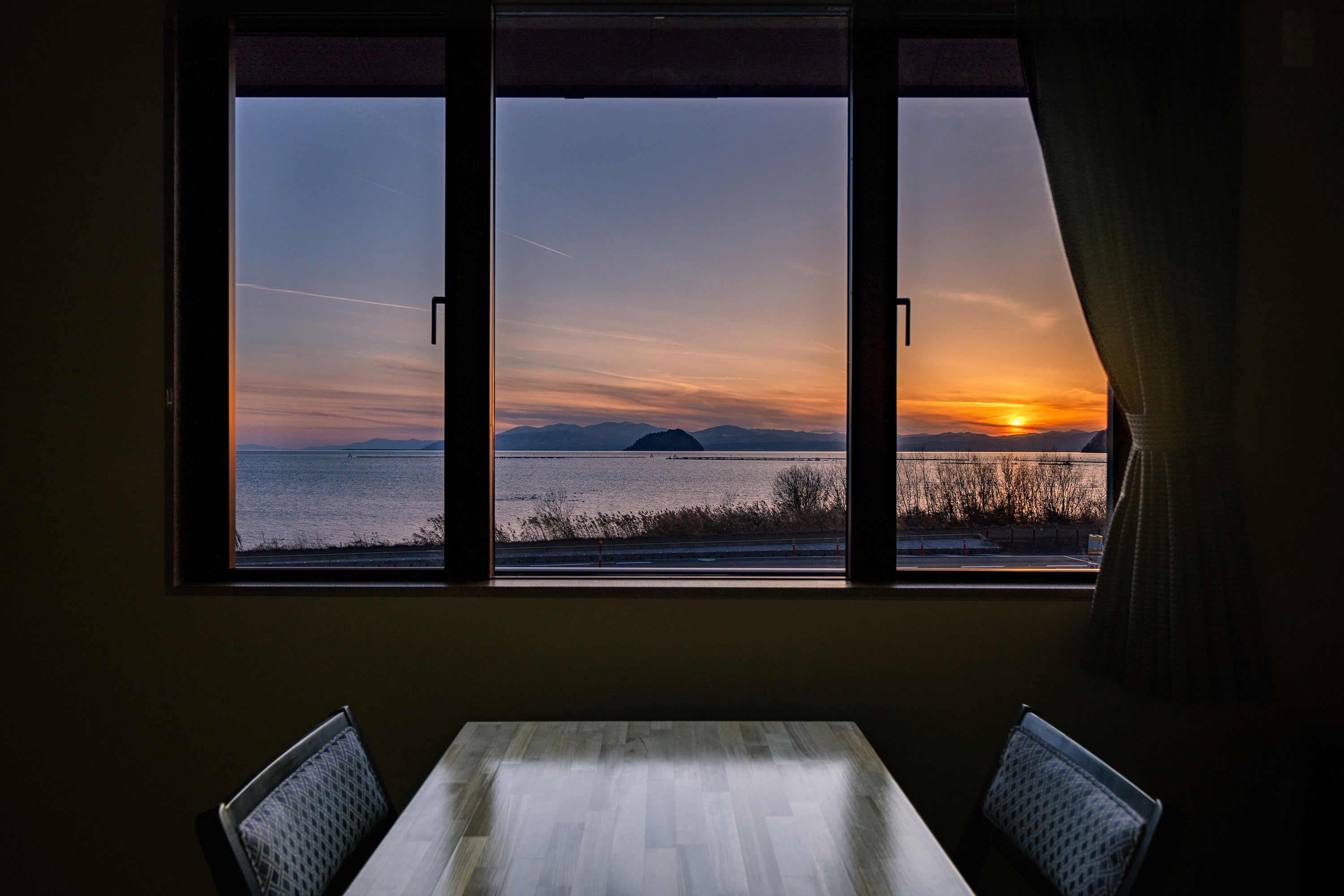 お部屋の窓から見える景色は、雄大なびわ湖が広がり、竹生島や夕陽、朝陽が楽しめます。特に、湖北町尾上から見る夕景は「日本の夕陽百選」に選ばれていて、一面が茜色に染まり、湖面に映る夕陽は幻想的です。