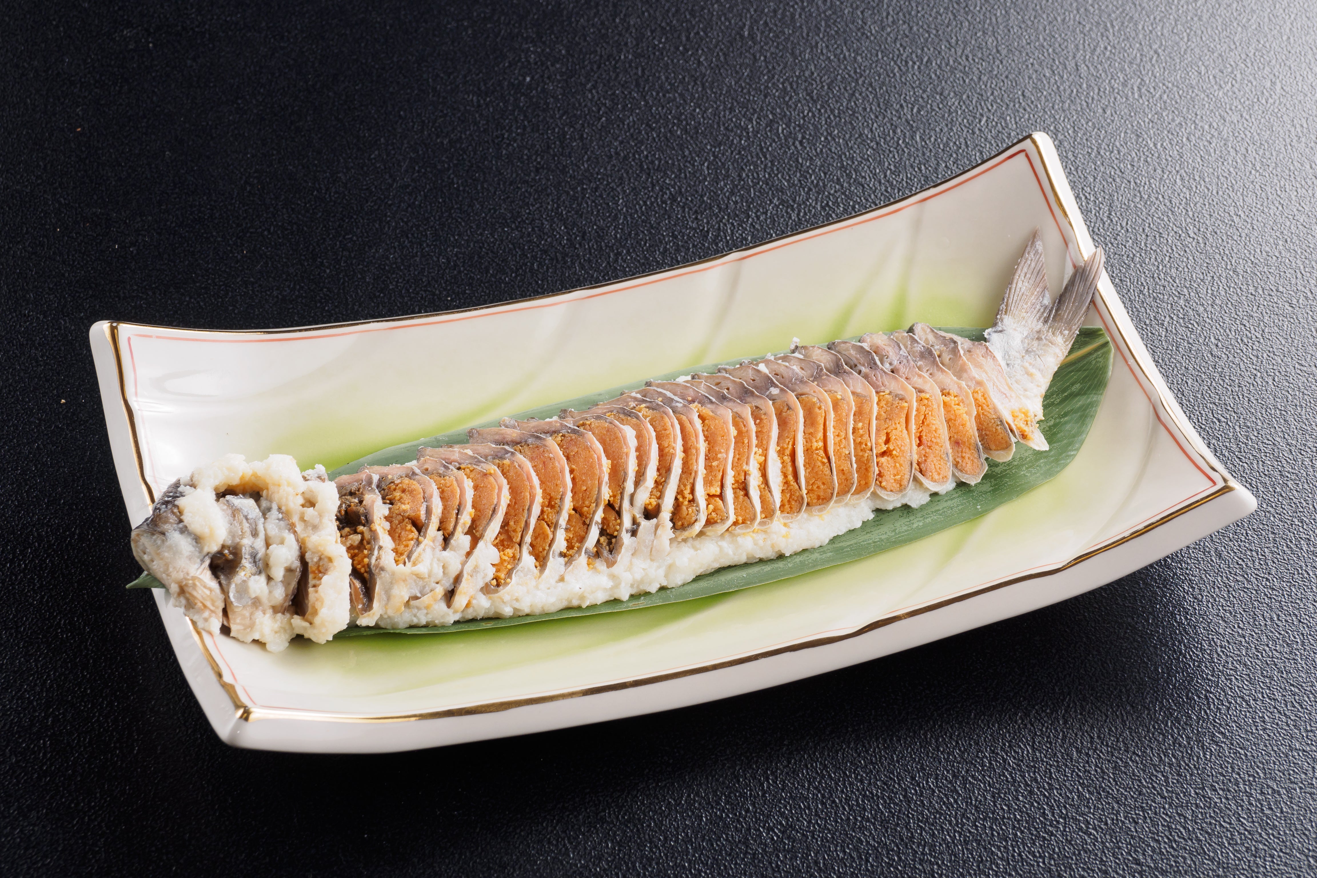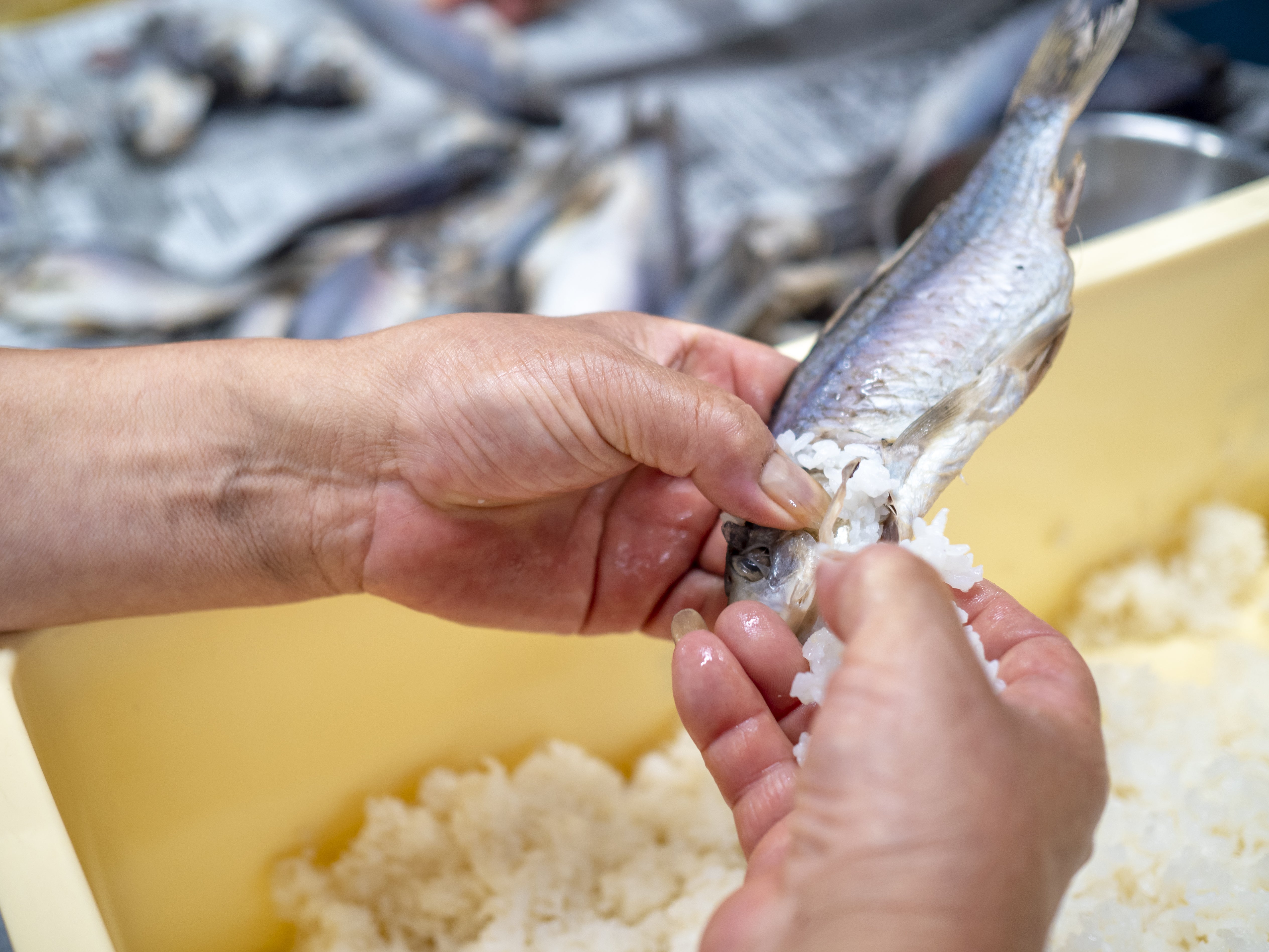 舟倉では、早春頃に漁獲した子持ちのニゴロブナを春~夏にかけて仕込み、数か月かけて発酵させてつくります。一般的なふなずしは発酵した独特な酸味のある強烈な匂いがしますが、当店のふなずしは臭みが少なく、チーズのようなまろやかな熟成した味わいが特徴です。