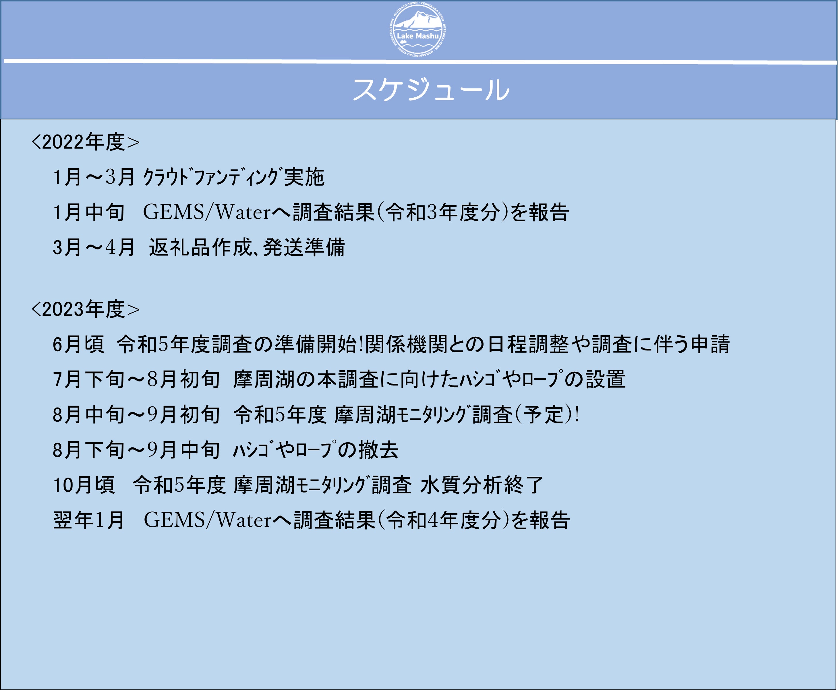 ・水質調査費用 150万円(摩周湖の水質分析費約120万円、調査船のメンテナンス費約15万円、その他調査備品購入費約15万円)・普及啓発活動 30万円(摩周湖での調査を紹介するチラシ、ポスター等の作成、普及啓発品の開発など)