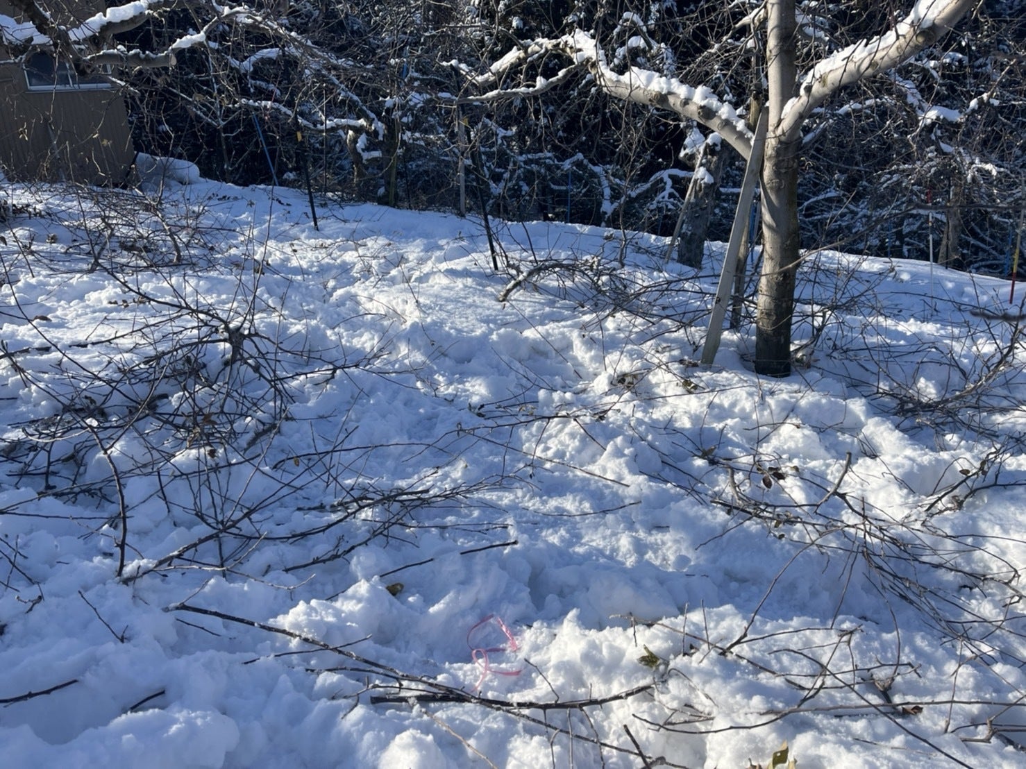 1月後半の全国的な寒波の襲来で、りんご園周辺も毎日のように雪が降り続きました。現在のところ、園地まではスノーシューを履いて10分ほど歩いて向かう必要があります。