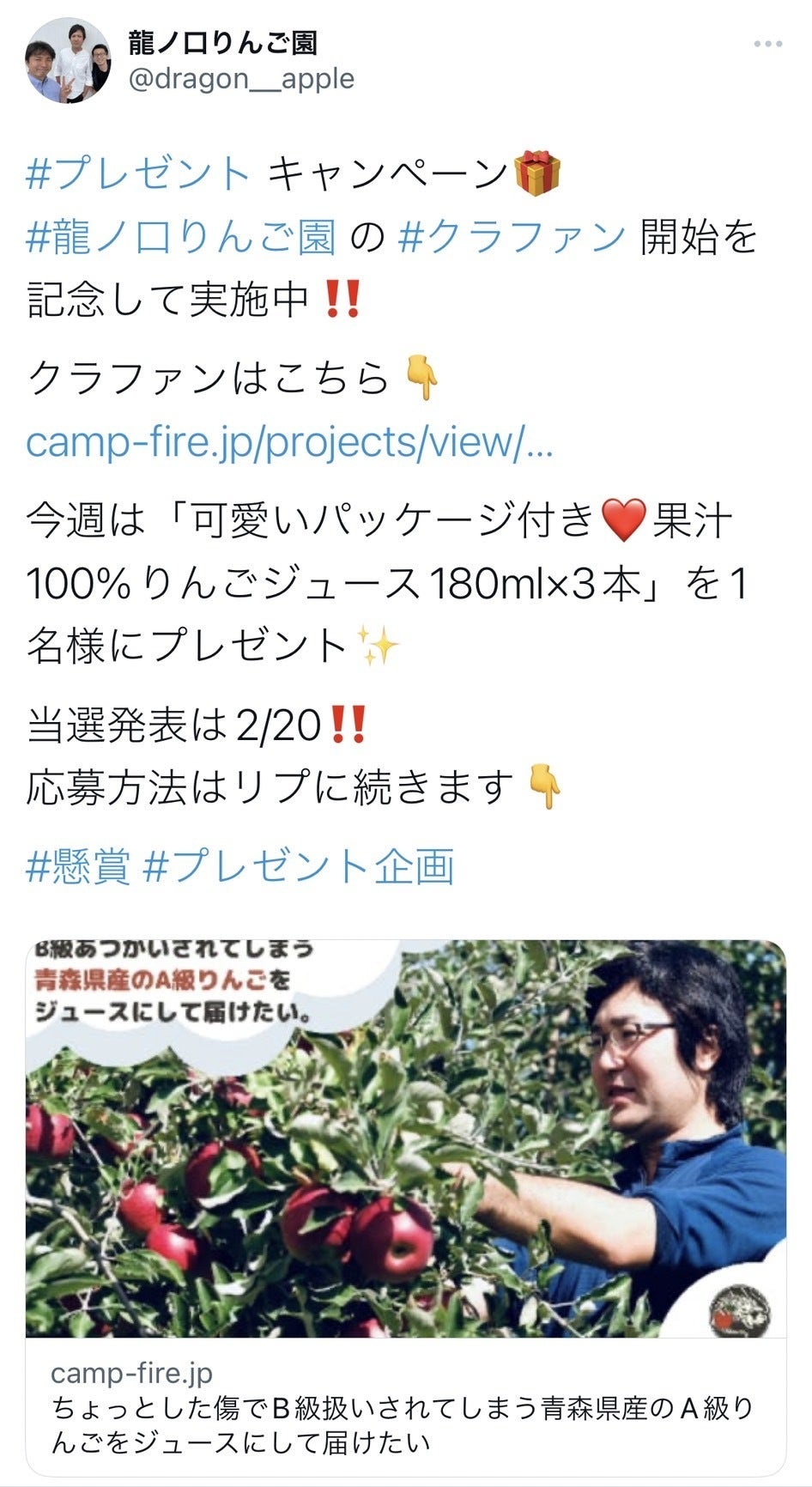 また、クラウドファンディング実施にあたって、より多くの人に知ってもらうためにプレゼントキャンペーンを実施しています。Twitter、Instagramで拡散して頂いた方の中から抽選で、リターンにもある『りんごジュース3本セット』をプレゼントしています。このプレゼントキャンペーンはクラウドファンディング実施中は複数回行う予定ですので、すでに支援して頂いた皆さんにも是非参加して頂きたいです。