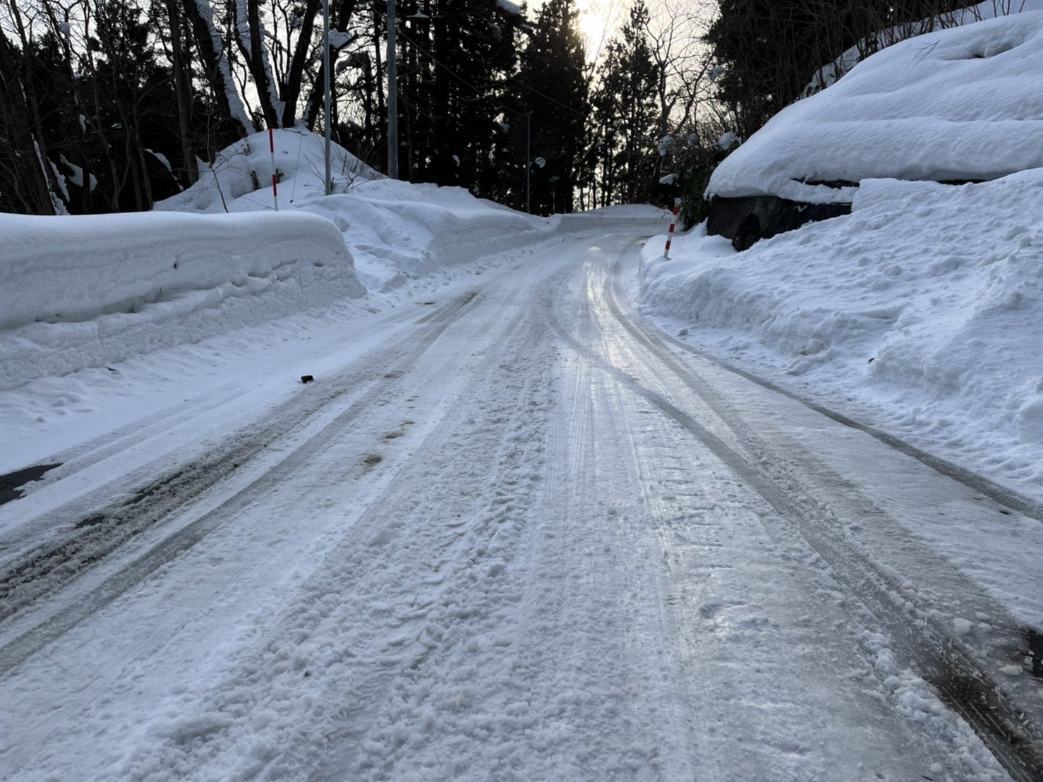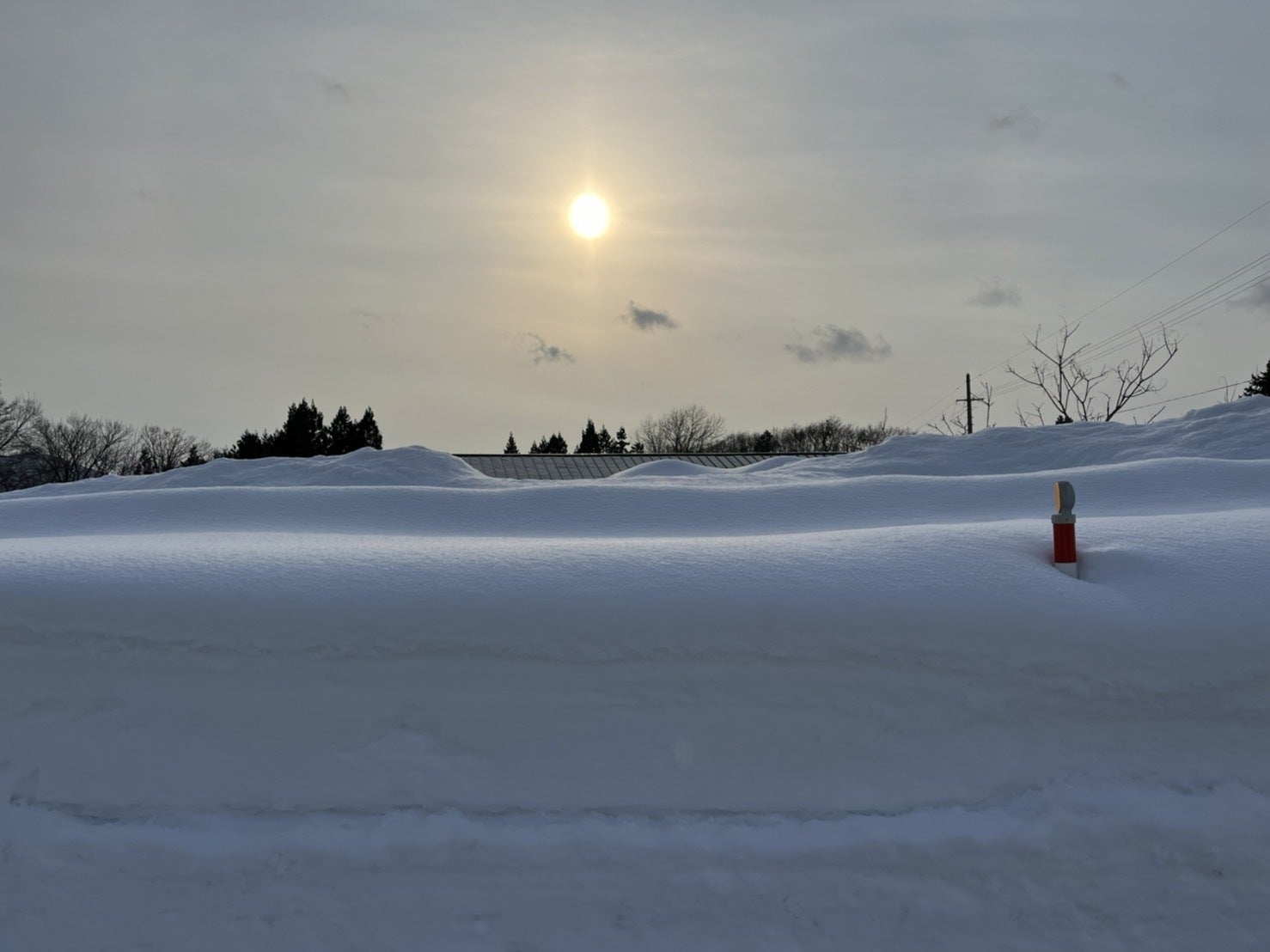 現在のりんごの様子ですが、更に降雪が進んでいます。地区へ向かう道中は、ロータリー除雪車の除雪跡が壁のようになっていました。