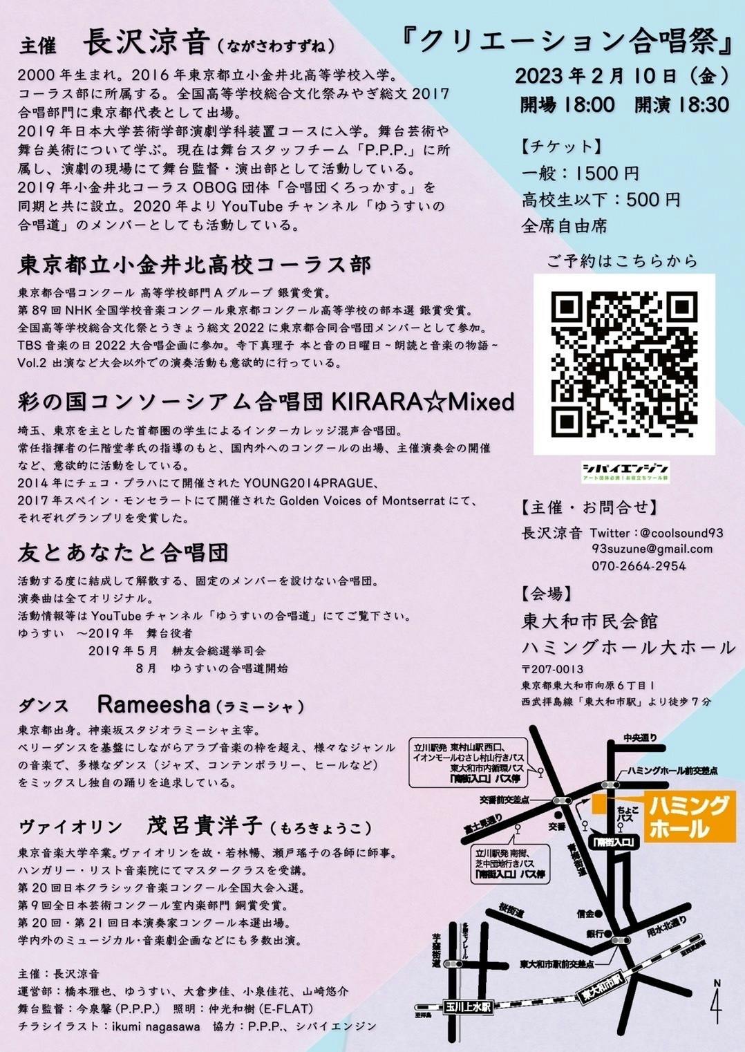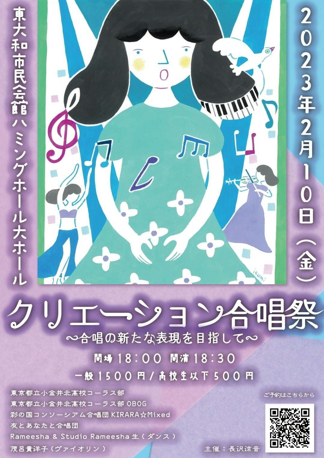 この度私一人で主催をして、2023年2月10日(金)東大和市民会館ハミングホール大ホールにて「クリエーション合唱祭」を開催することとなりました。合唱と舞台芸術の融合を目指し、ダンス・ヴァイオリン・照明・舞台セットなど多彩な演出で楽しめる合唱コンサートです。