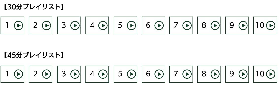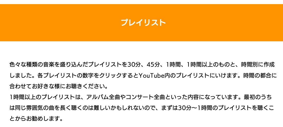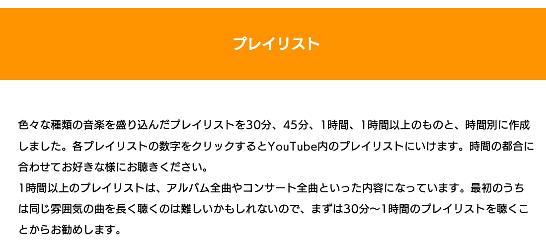 ※プレイリスト: 厳選された色々なジャンルの曲をリストにしたものをユーチューブ内で聴けるようにしてあります。指示に従ってリンクをクリックして、毎日曲を流してあげるだけで結構です。